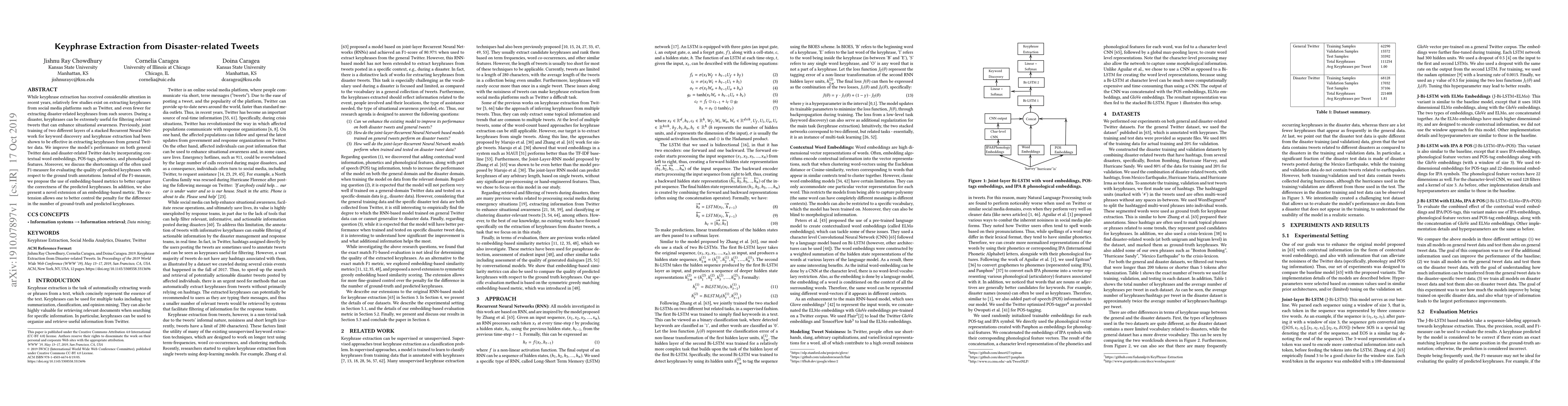 This paper enhances keyphrase extraction from disaster-related tweets by improving a stacked Recurrent Neural Network model with contextual embeddings and linguistic features. It critiques the F1-measure for evaluating keyphrase extraction and proposes embedding-based metrics for better accuracy assessment.