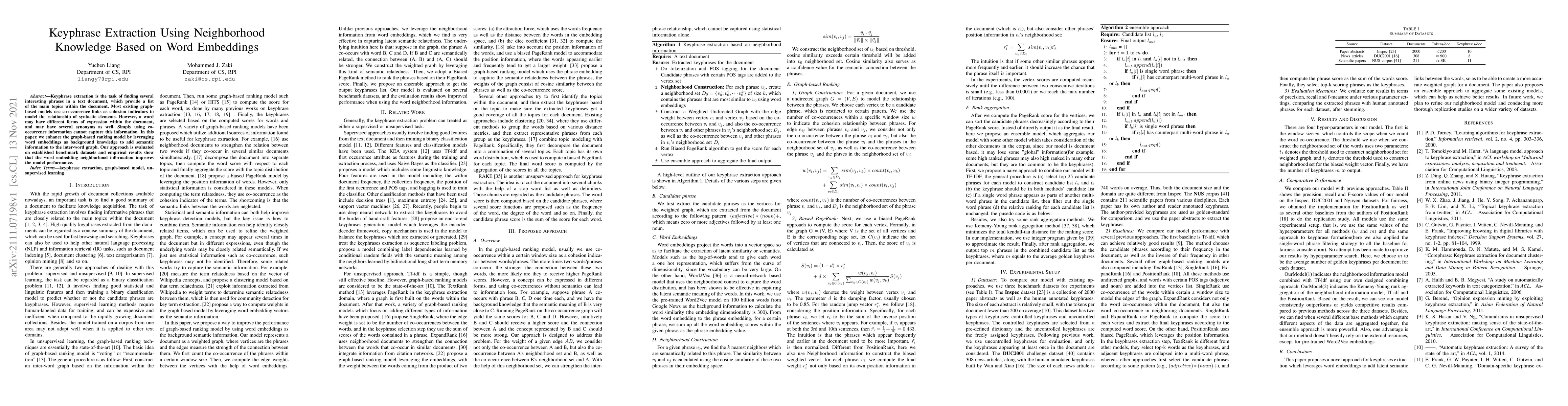 This paper proposes a keyphrase extraction method that enhances graph-based ranking models by incorporating word embeddings to capture semantic relationships beyond co-occurrence links. The results demonstrate improved performance on benchmark datasets due to the added semantic information from word embedding neighborhoods.