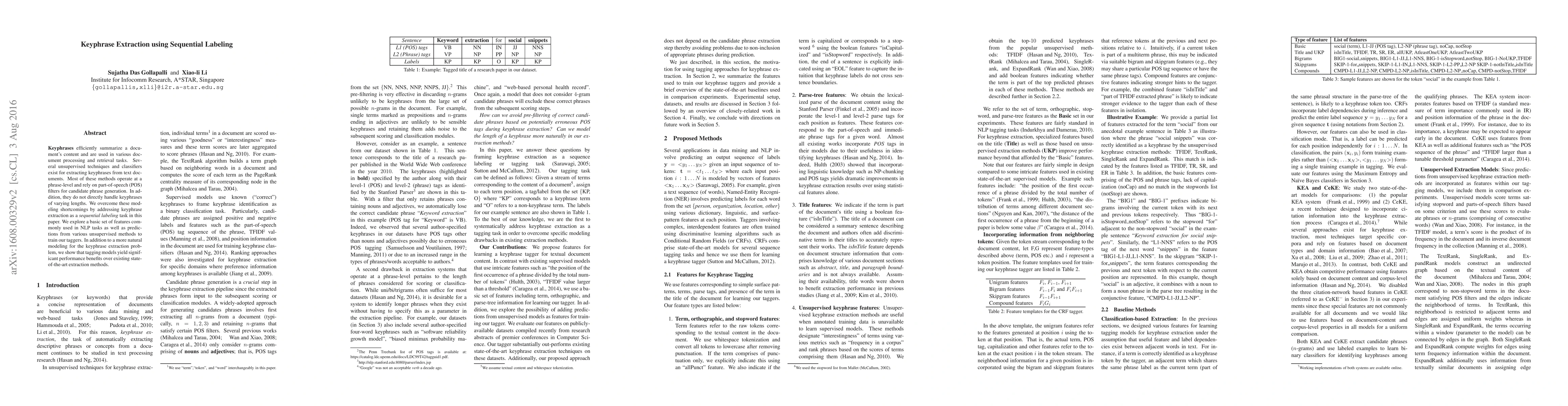 This paper addresses keyphrase extraction as a sequential labeling task using Conditional Random Fields (CRFs), incorporating basic NLP features and predictions from unsupervised keyphrase extraction methods. It compares the performance with existing classification-based approaches and unsupervised methods.