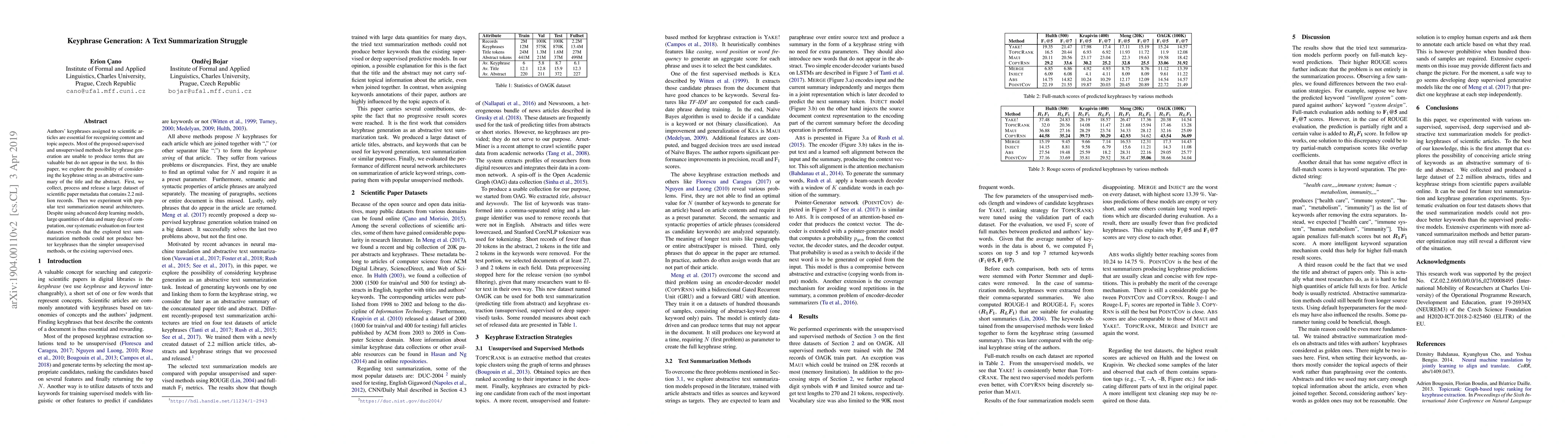 The paper presents OAGK, a large dataset of 2.2 million scientific paper records, and evaluates various text summarization and keyphrase extraction methods, revealing the limitations of current abstractive summarization models for keyphrase generation.