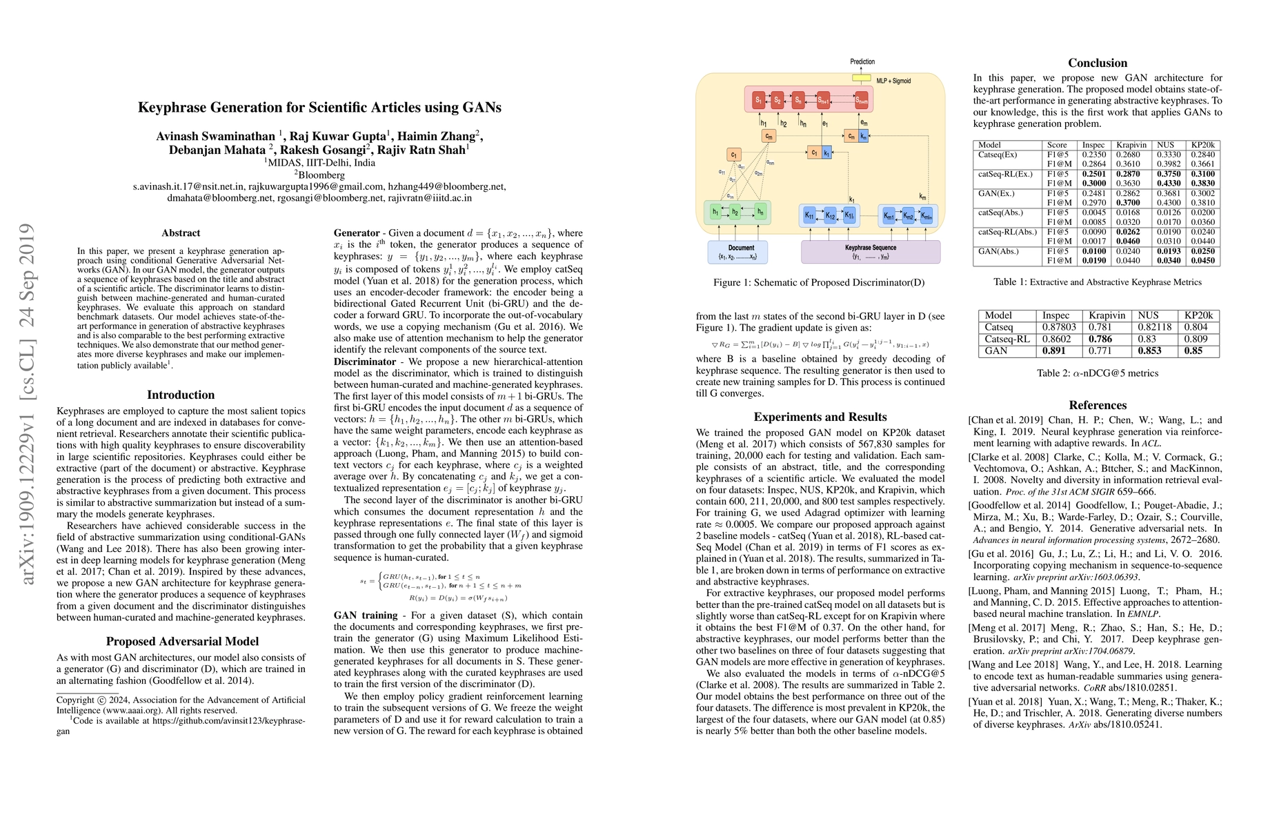 The research proposes a new GAN architecture for keyphrase generation, consisting of a generator that produces a sequence of keyphrases from a document and a discriminator trained to distinguish between human-curated and machine-generated keyphrases.