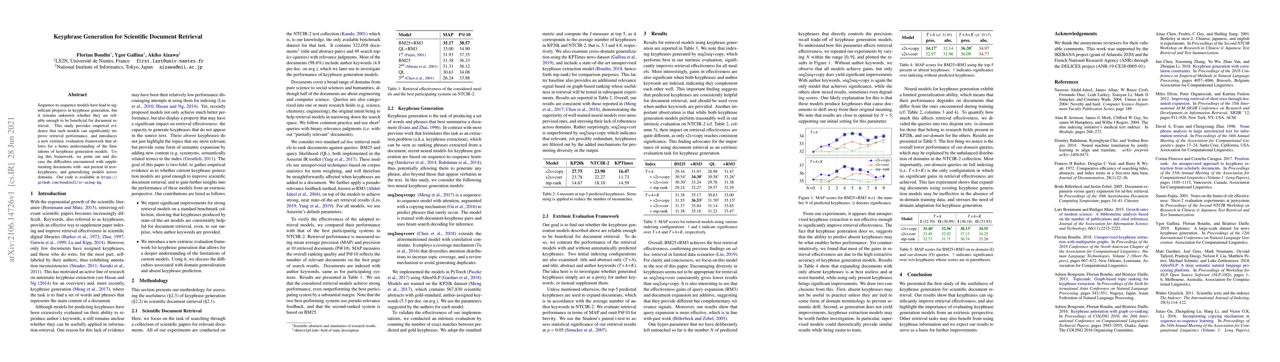 The paper presents an extrinsic evaluation framework for keyphrase generation models, focusing on their utility for document retrieval, and demonstrates that well-trained neural models can significantly improve retrieval effectiveness.