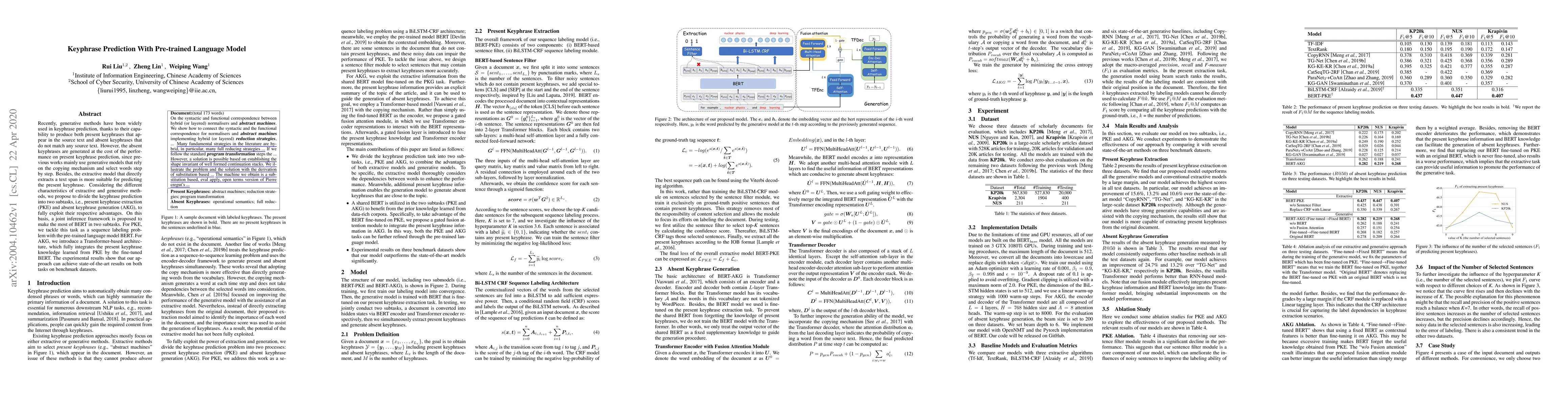 This paper proposes a dual-task framework for keyphrase prediction using BERT, dividing it into present keyphrase extraction (PKE) and absent keyphrase generation (AKG). The method achieves state-of-the-art results by leveraging BERT for PKE and a Transformer-based model for AKG, integrating knowledge from PKE to enhance absent keyphrase generation.