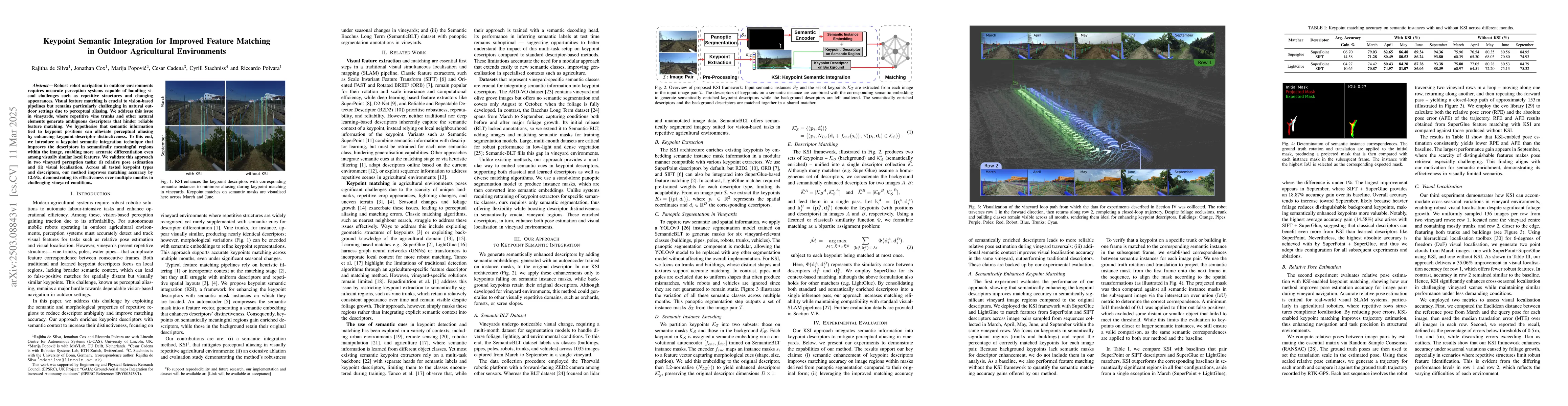 The paper presents a novel keypoint semantic integration technique that enriches keypoint descriptors with semantic information, improving feature matching accuracy in challenging outdoor agricultural environments.