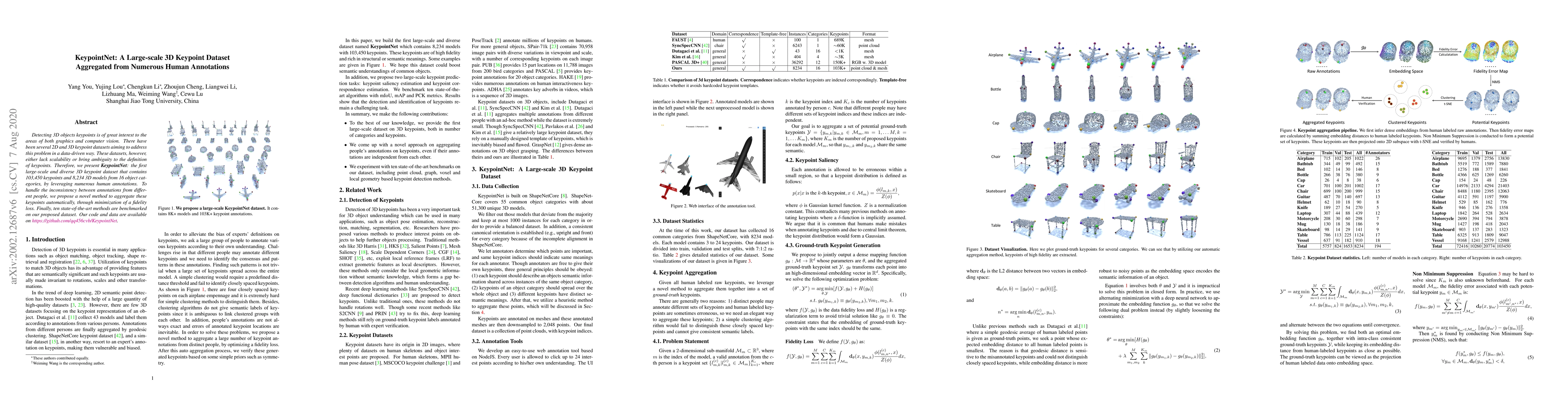 Detecting 3D objects keypoints is of great interest to the areas of both graphics and computer vision. There have been several 2D and 3D keypoint datasets aiming to address this problem in a data-driven way. These datasets, however, either lack scalability or bring ambiguity to the definition of keypoints. Therefore, we present KeypointNet: the first large-scale and diverse 3D keypoint dataset that contains 103,450 keypoints and 8,234 3D models from 16 object categories, by leveraging numerous human annotations. To handle the inconsistency between annotations from different people, we propose a novel method to aggregate these keypoints automatically, through minimization of a fidelity loss. Finally, ten state-of-the-art methods are benchmarked on our proposed dataset. Our code and data are available on https://github.com/qq456cvb/KeypointNet.