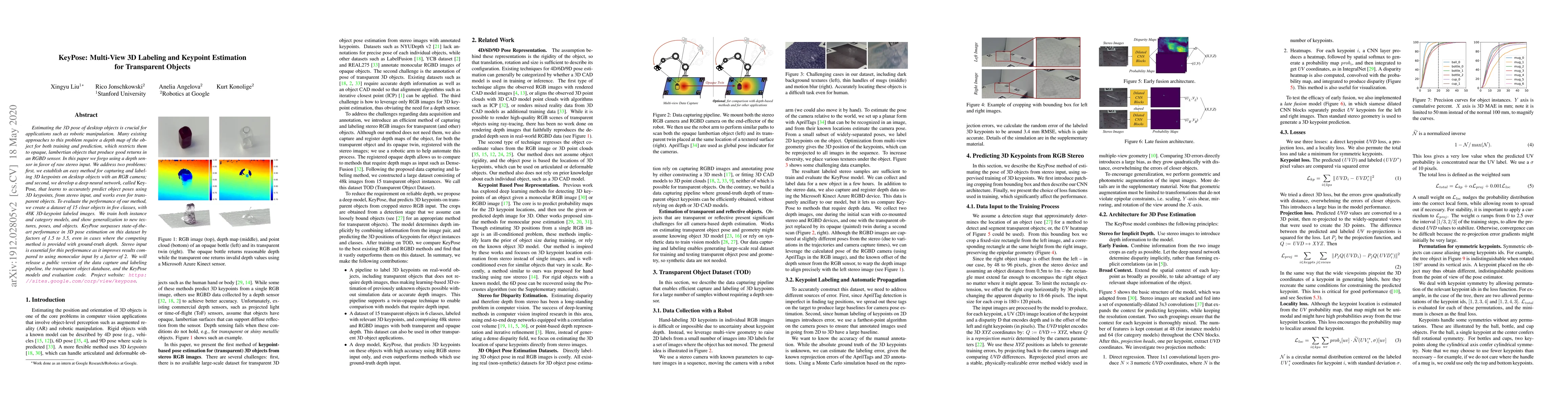 Estimating the 3D pose of desktop objects is crucial for applications such as robotic manipulation. Many existing approaches to this problem require a depth map of the object for both training and prediction, which restricts them to opaque, lambertian objects that produce good returns in an RGBD sensor. In this paper we forgo using a depth sensor in favor of raw stereo input. We address two problems: first, we establish an easy method for capturing and labeling 3D keypoints on desktop objects with an RGB camera; and second, we develop a deep neural network, called $KeyPose$, that learns to accurately predict object poses using 3D keypoints, from stereo input, and works even for transparent objects. To evaluate the performance of our method, we create a dataset of 15 clear objects in five classes, with 48K 3D-keypoint labeled images. We train both instance and category models, and show generalization to new textures, poses, and objects. KeyPose surpasses state-of-the-art performance in 3D pose estimation on this dataset by factors of 1.5 to 3.5, even in cases where the competing method is provided with ground-truth depth. Stereo input is essential for this performance as it improves results compared to using monocular input by a factor of 2. We will release a public version of the data capture and labeling pipeline, the transparent object database, and the KeyPose models and evaluation code. Project website: https://sites.google.com/corp/view/keypose.