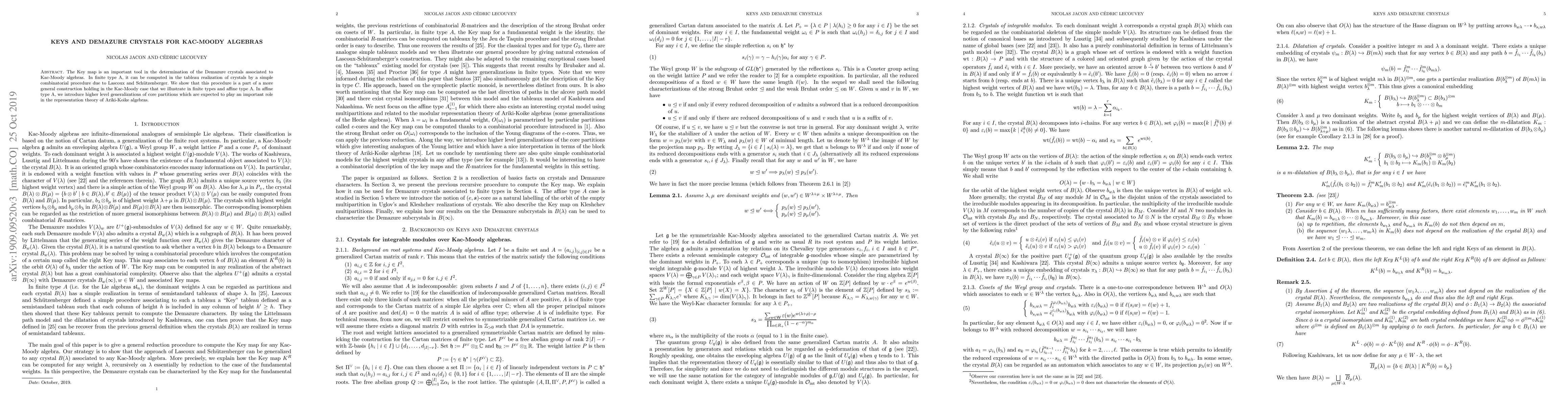 This paper explores the Key map's role in determining Demazure crystals for Kac-Moody algebras, demonstrating its combinatorial computation in finite type A. It extends this to the Kac-Moody case, introducing higher level generalizations of core partitions in affine type A that may parametrize distinguished elements in Ariki-Koike algebras.