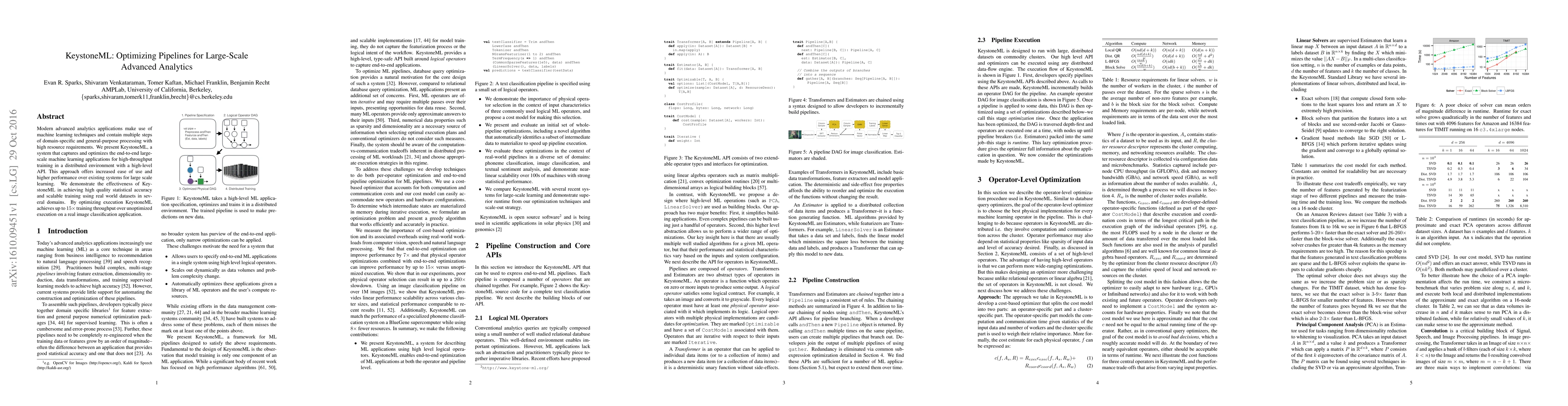 KeystoneML is a system designed to optimize large-scale machine learning pipelines, offering a high-level API for ease of use and improved performance in distributed environments. It achieves up to 15x higher training throughput compared to unoptimized execution, demonstrating effectiveness in statistical accuracy and scalability across various real-world datasets.