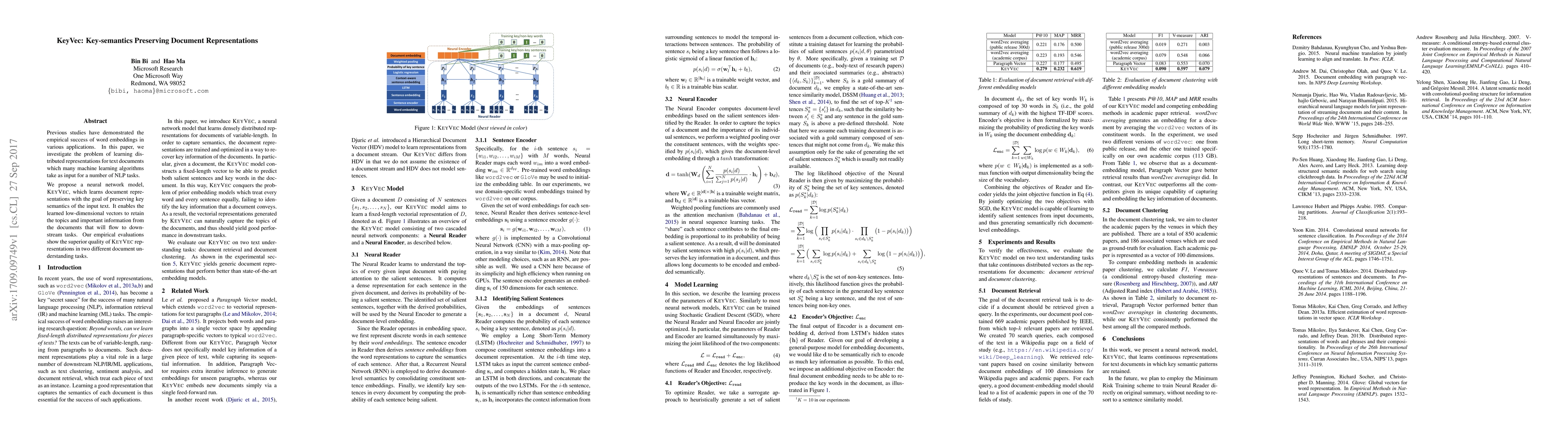 This paper proposes KeyVec, a neural network model that learns document representations while preserving key semantics, enabling downstream NLP tasks to retain important topics and information. Empirical evaluations demonstrate KeyVec's superior performance in document understanding tasks.