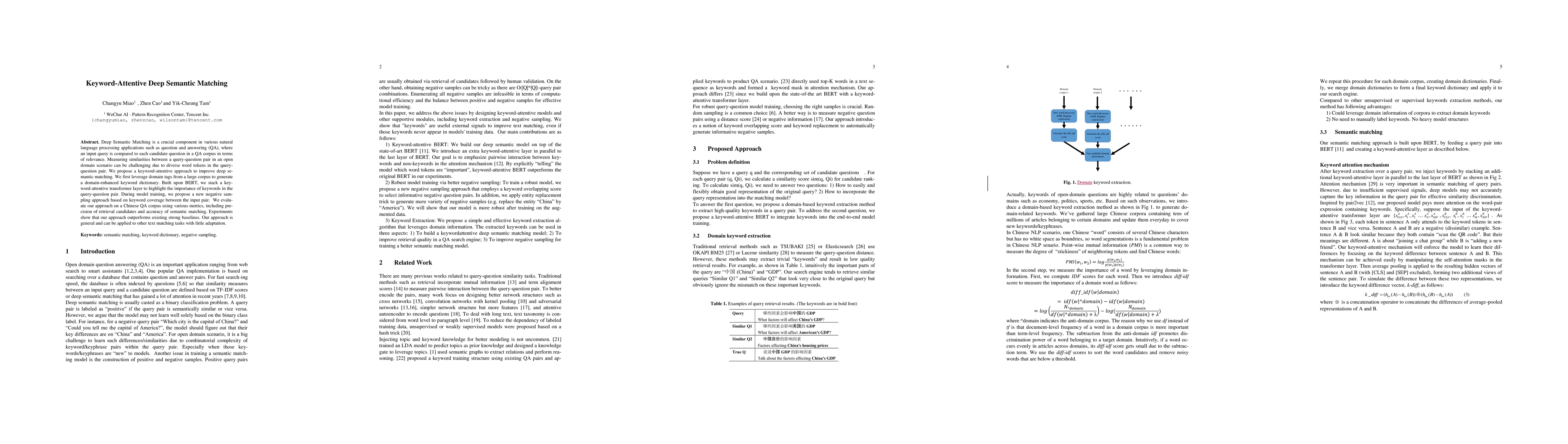 This paper proposes a keyword-attentive deep semantic matching approach to enhance relevance measurement in question-answering systems. It utilizes a domain-enhanced keyword dictionary and a transformer layer to emphasize keyword importance, achieving superior performance over baselines in Chinese QA tasks.