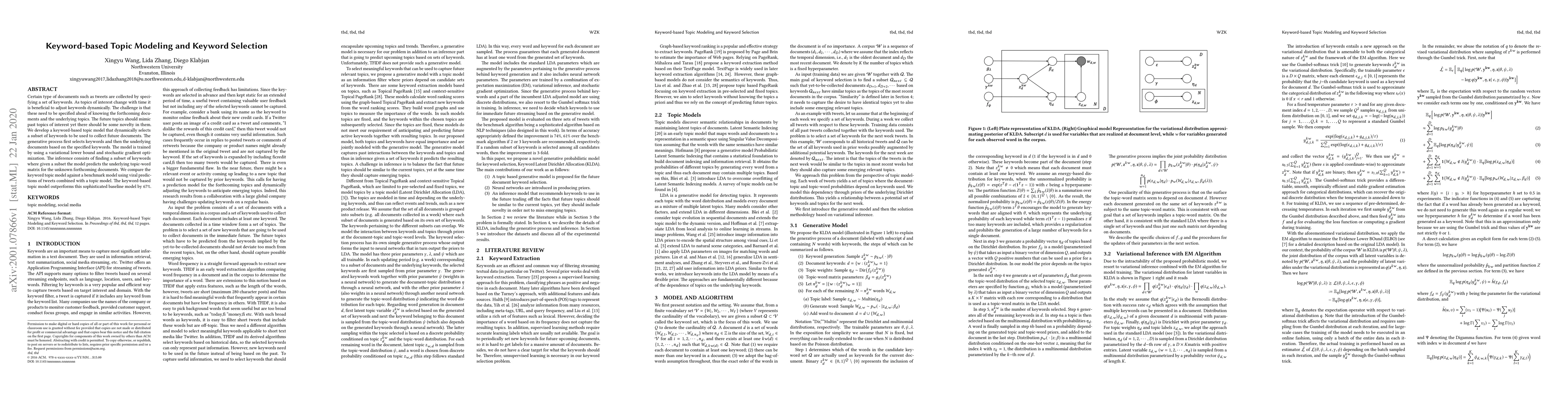 This paper proposes a keyword-based topic model for dynamically selecting keywords to collect future documents, balancing past topics with novelty. The model outperforms a benchmark by 67% in viral tweet predictions.