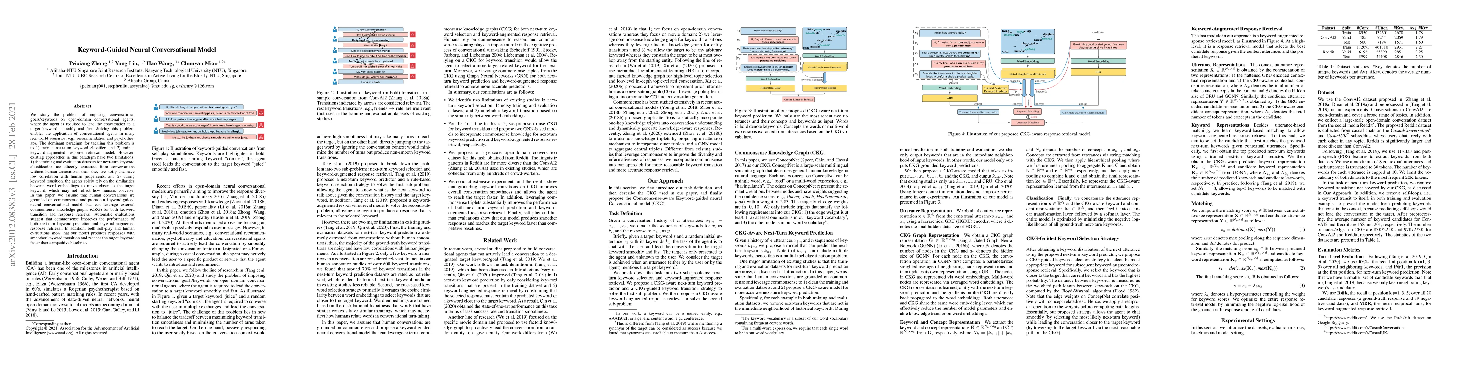 We study the problem of imposing conversational goals/keywords on open-domain conversational agents, where the agent is required to lead the conversation to a target keyword smoothly and fast. Solving this problem enables the application of conversational agents in many real-world scenarios, e.g., recommendation and psychotherapy. The dominant paradigm for tackling this problem is to 1) train a next-turn keyword classifier, and 2) train a keyword-augmented response retrieval model. However, existing approaches in this paradigm have two limitations: 1) the training and evaluation datasets for next-turn keyword classification are directly extracted from conversations without human annotations, thus, they are noisy and have low correlation with human judgements, and 2) during keyword transition, the agents solely rely on the similarities between word embeddings to move closer to the target keyword, which may not reflect how humans converse. In this paper, we assume that human conversations are grounded on commonsense and propose a keyword-guided neural conversational model that can leverage external commonsense knowledge graphs (CKG) for both keyword transition and response retrieval. Automatic evaluations suggest that commonsense improves the performance of both next-turn keyword prediction and keyword-augmented response retrieval. In addition, both self-play and human evaluations show that our model produces responses with smoother keyword transition and reaches the target keyword faster than competitive baselines.