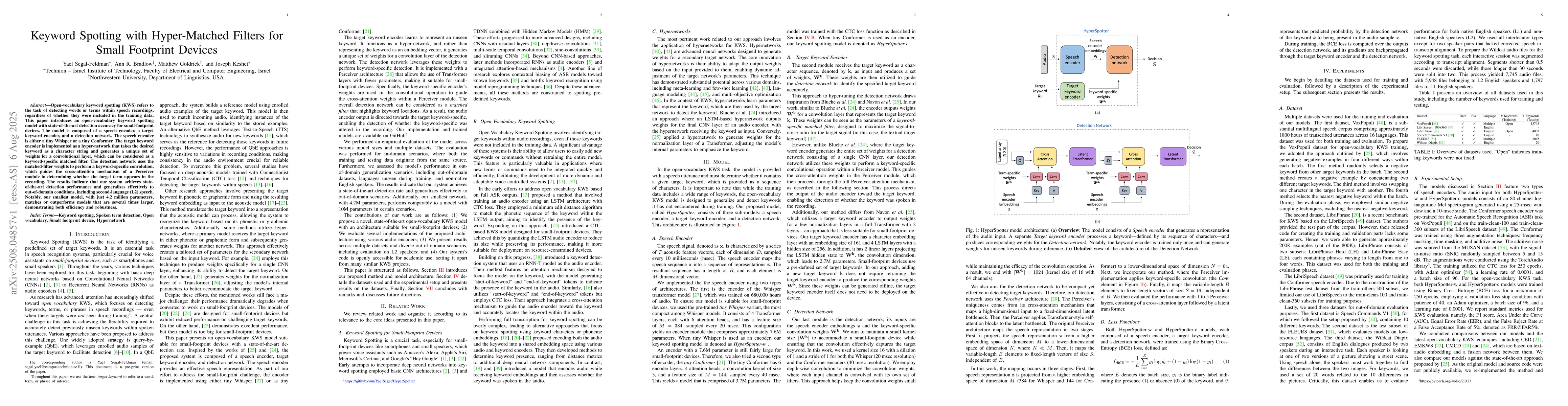 Open-vocabulary keyword spotting (KWS) refers to the task of detecting words or terms within speech recordings, regardless of whether they were included in the training data. This paper introduces an open-vocabulary keyword spotting model with state-of-the-art detection accuracy for small-footprint devices. The model is composed of a speech encoder, a target keyword encoder, and a detection network. The speech encoder is either a tiny Whisper or a tiny Conformer. The target keyword encoder is implemented as a hyper-network that takes the desired keyword as a character string and generates a unique set of weights for a convolutional layer, which can be considered as a keyword-specific matched filter. The detection network uses the matched-filter weights to perform a keyword-specific convolution, which guides the cross-attention mechanism of a Perceiver module in determining whether the target term appears in the recording. The results indicate that our system achieves state-of-the-art detection performance and generalizes effectively to out-of-domain conditions, including second-language (L2) speech. Notably, our smallest model, with just 4.2 million parameters, matches or outperforms models that are several times larger, demonstrating both efficiency and robustness.