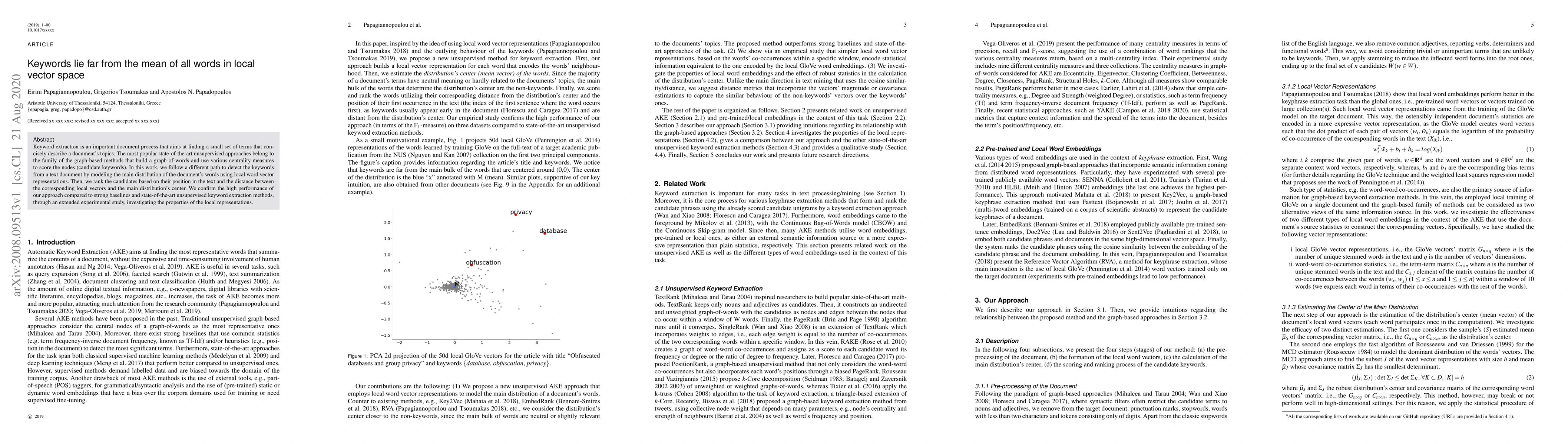 This paper proposes a novel approach to keyword extraction that uses local word vector representations to identify key terms in a document. It outperforms state-of-the-art methods with an experimental study investigating the properties of these local representations.