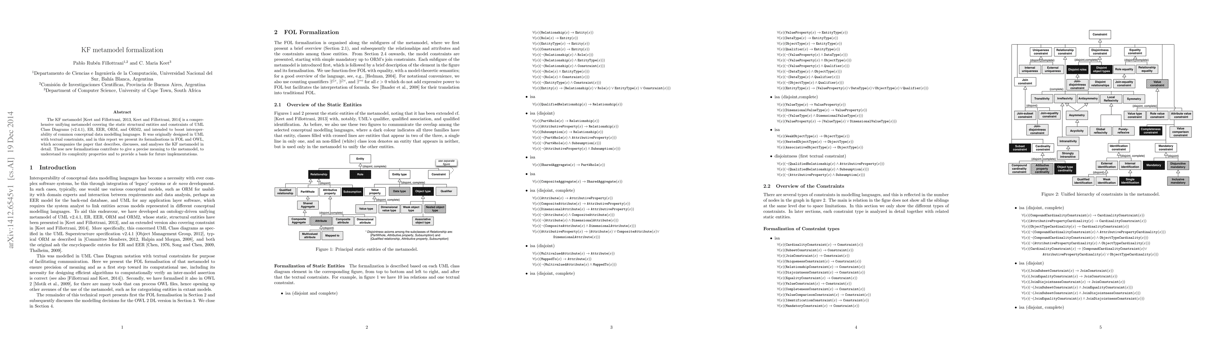 The KF metamodel unifies various conceptual data modeling languages and is now formally presented in First-Order Logic (FOL) and Ontology Web Language (OWL) to enhance its precision and interoperability, alongside detailed analysis and discussion of its structural entities and constraints. These formalizations aim to clarify the metamodel's complexity and lay the groundwork for future implementations.