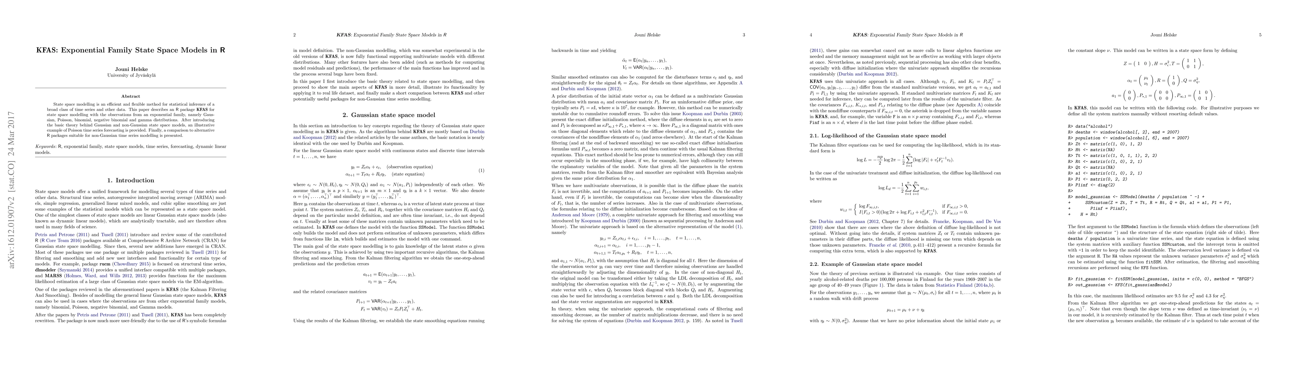 This paper introduces the R package KFAS for state space modelling using exponential family distributions, including Gaussian, Poisson, binomial, negative binomial, and gamma. It provides an example of Poisson time series forecasting and compares KFAS to other R packages for non-Gaussian time series analysis.