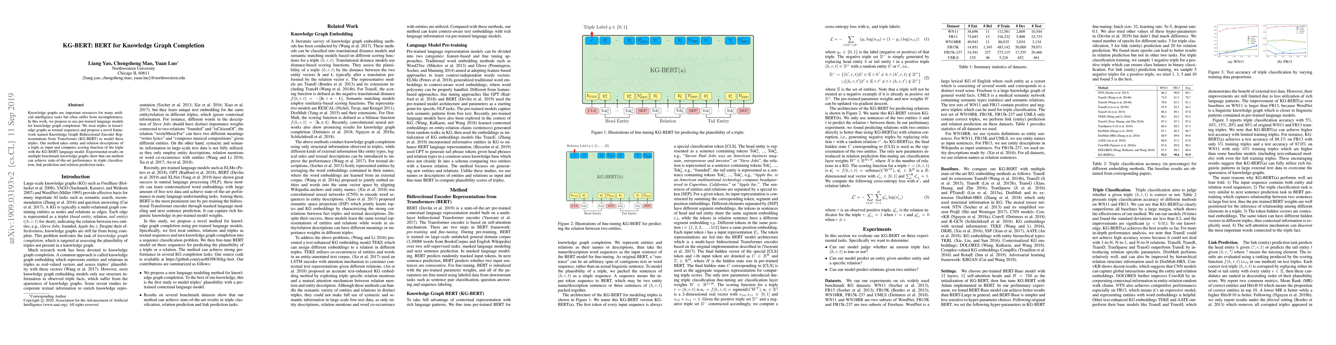 KG-BERT leverages pre-trained language models to enhance knowledge graph completion by treating triples as textual sequences. This approach achieves state-of-the-art results in triple classification, link prediction, and relation prediction across various benchmarks.