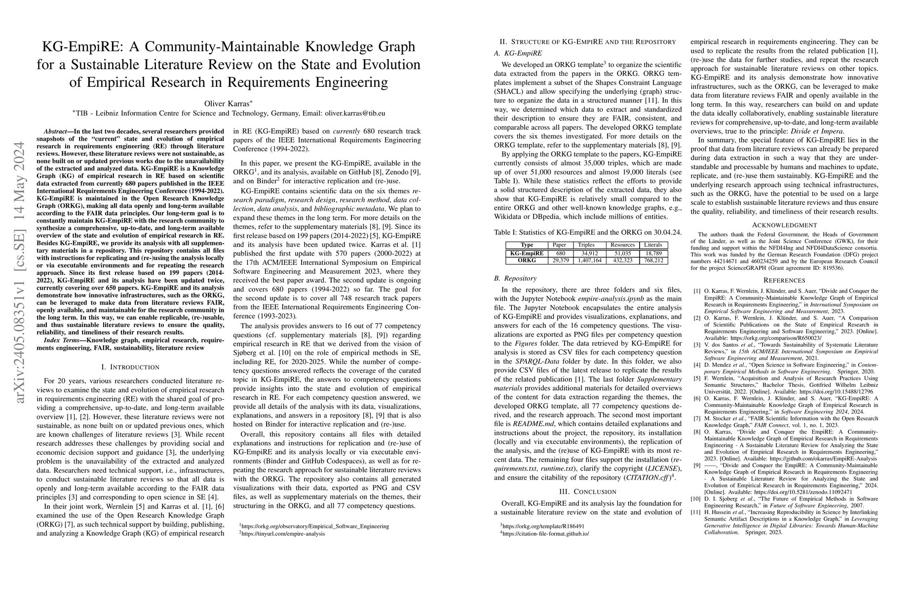 KG-EmpiRE is a Knowledge Graph of empirical research in requirements engineering, constructed from 680 papers and maintained in the Open Research Knowledge Graph (ORKG). Its goal is to provide a sustainable, FAIR, and community-maintainable literature review resource for the evolution of empirical research in RE.