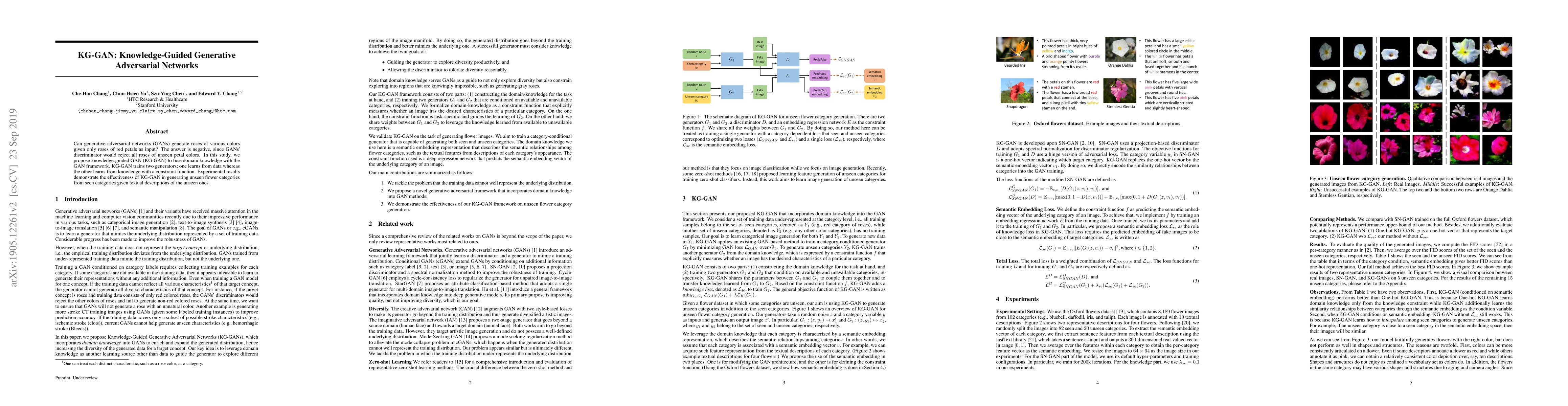 The KG-GAN framework integrates domain knowledge with GANs to generate new flower categories from seen ones, using textual descriptions for unseen categories. Experimental results show KG-GAN's effectiveness in overcoming the GAN's limitation of generating only variations seen in the training data.