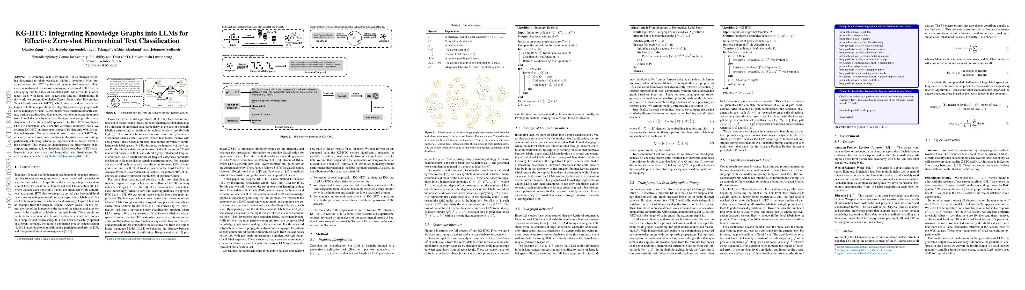 This research paper introduces KG-HTC, a method that combines Large Language Models with knowledge graphs to improve hierarchical text classification, achieving significant improvements in zero-shot settings and addressing challenges of large label spaces and long-tail distributions.