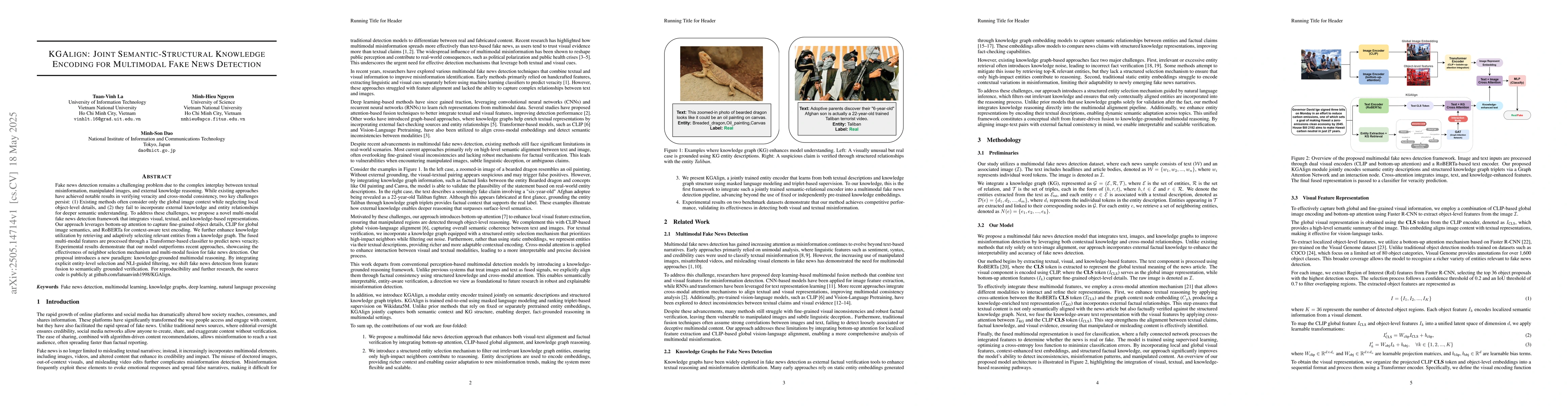 Fake news detection remains a challenging problem due to the complex interplay between textual misinformation, manipulated images, and external knowledge reasoning. While existing approaches have achieved notable results in verifying veracity and cross-modal consistency, two key challenges persist: (1) Existing methods often consider only the global image context while neglecting local object-level details, and (2) they fail to incorporate external knowledge and entity relationships for deeper semantic understanding. To address these challenges, we propose a novel multi-modal fake news detection framework that integrates visual, textual, and knowledge-based representations. Our approach leverages bottom-up attention to capture fine-grained object details, CLIP for global image semantics, and RoBERTa for context-aware text encoding. We further enhance knowledge utilization by retrieving and adaptively selecting relevant entities from a knowledge graph. The fused multi-modal features are processed through a Transformer-based classifier to predict news veracity. Experimental results demonstrate that our model outperforms recent approaches, showcasing the effectiveness of neighbor selection mechanism and multi-modal fusion for fake news detection. Our proposal introduces a new paradigm: knowledge-grounded multimodal reasoning. By integrating explicit entity-level selection and NLI-guided filtering, we shift fake news detection from feature fusion to semantically grounded verification. For reproducibility and further research, the source code is publicly at \href{https://github.com/latuanvinh1998/KGAlign}{github.com/latuanvinh1998/KGAlign}.