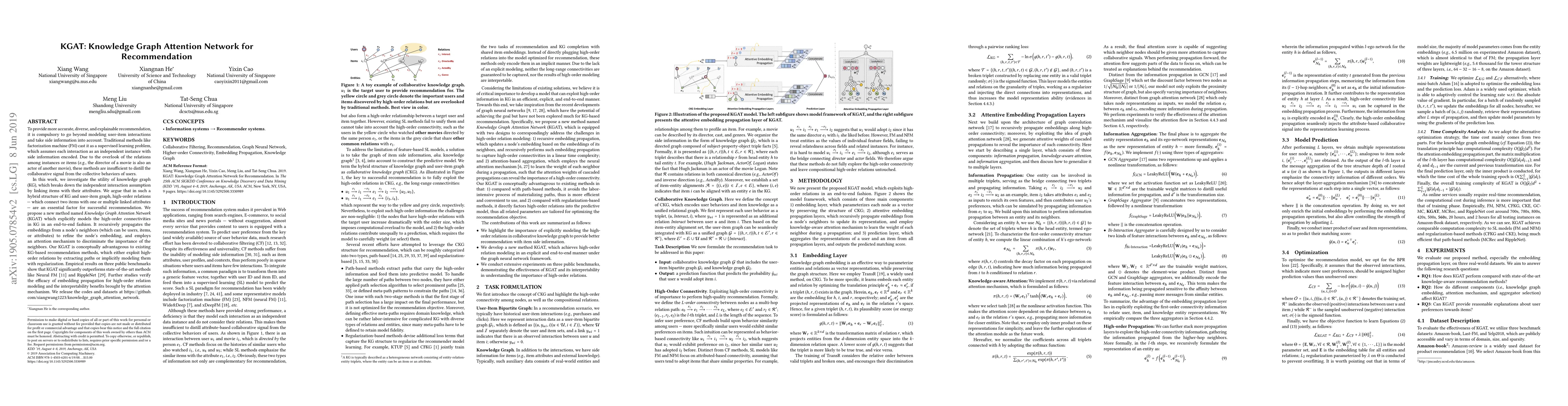 To provide more accurate, diverse, and explainable recommendation, it is compulsory to go beyond modeling user-item interactions and take side information into account. Traditional methods like factorization machine (FM) cast it as a supervised learning problem, which assumes each interaction as an independent instance with side information encoded. Due to the overlook of the relations among instances or items (e.g., the director of a movie is also an actor of another movie), these methods are insufficient to distill the collaborative signal from the collective behaviors of users. In this work, we investigate the utility of knowledge graph (KG), which breaks down the independent interaction assumption by linking items with their attributes. We argue that in such a hybrid structure of KG and user-item graph, high-order relations --- which connect two items with one or multiple linked attributes --- are an essential factor for successful recommendation. We propose a new method named Knowledge Graph Attention Network (KGAT) which explicitly models the high-order connectivities in KG in an end-to-end fashion. It recursively propagates the embeddings from a node's neighbors (which can be users, items, or attributes) to refine the node's embedding, and employs an attention mechanism to discriminate the importance of the neighbors. Our KGAT is conceptually advantageous to existing KG-based recommendation methods, which either exploit high-order relations by extracting paths or implicitly modeling them with regularization. Empirical results on three public benchmarks show that KGAT significantly outperforms state-of-the-art methods like Neural FM and RippleNet. Further studies verify the efficacy of embedding propagation for high-order relation modeling and the interpretability benefits brought by the attention mechanism.