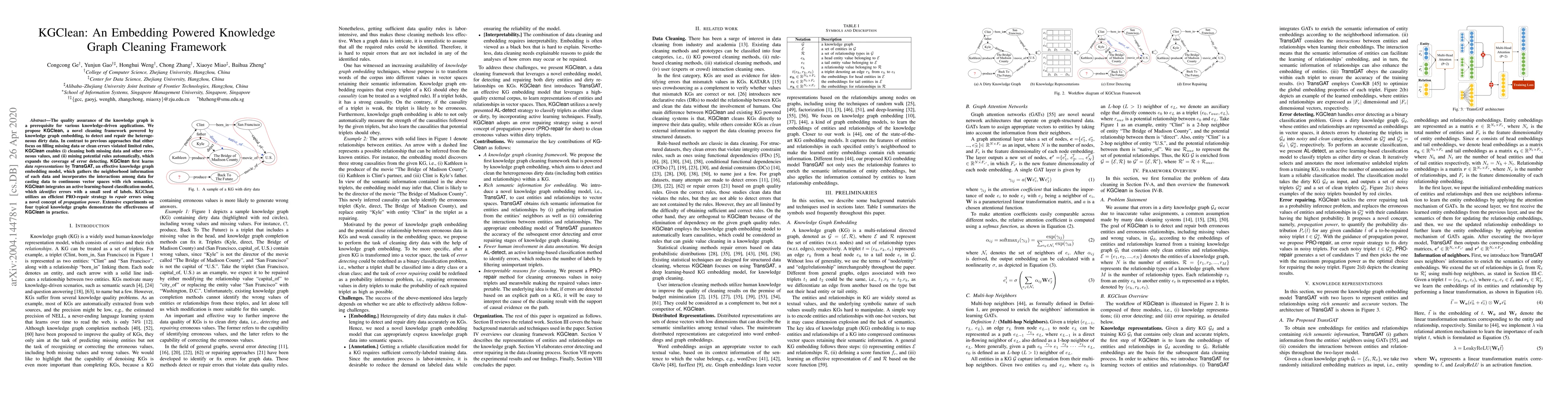 KGClean is a novel framework that leverages knowledge graph embedding to detect and repair heterogeneous data errors, offering a comprehensive approach to both missing data and other erroneous values, and automatically mining potential rules for broader error detection. It employs TransGAT for rich semantic representations and an active learning-based model for error identification, followed by a PRO-repair strategy for efficient error correction.