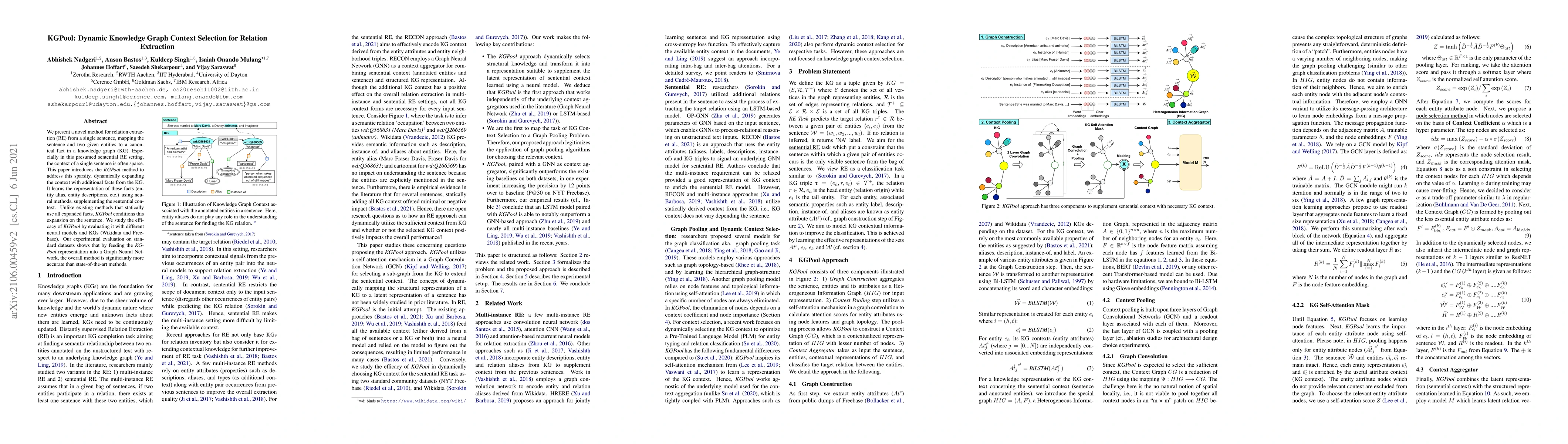 We present a novel method for relation extraction (RE) from a single sentence, mapping the sentence and two given entities to a canonical fact in a knowledge graph (KG). Especially in this presumed sentential RE setting, the context of a single sentence is often sparse. This paper introduces the KGPool method to address this sparsity, dynamically expanding the context with additional facts from the KG. It learns the representation of these facts (entity alias, entity descriptions, etc.) using neural methods, supplementing the sentential context. Unlike existing methods that statically use all expanded facts, KGPool conditions this expansion on the sentence. We study the efficacy of KGPool by evaluating it with different neural models and KGs (Wikidata and NYT Freebase). Our experimental evaluation on standard datasets shows that by feeding the KGPool representation into a Graph Neural Network, the overall method is significantly more accurate than state-of-the-art methods.