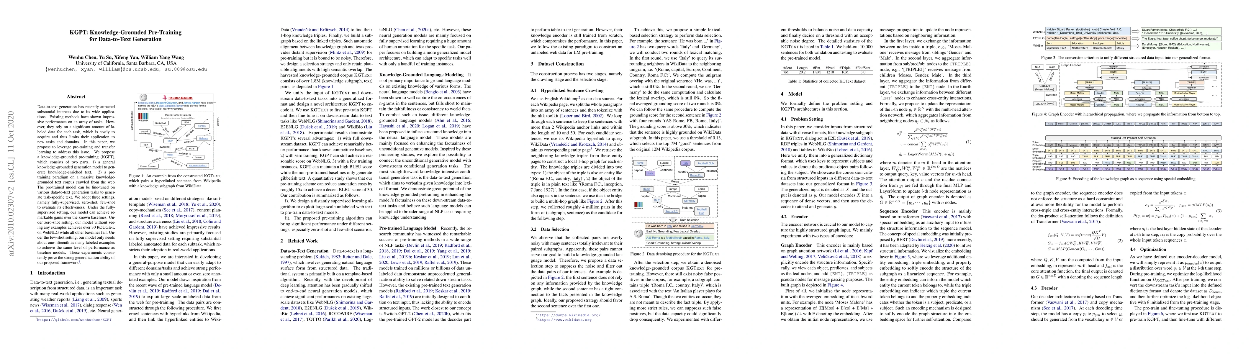This paper introduces KGPT, a knowledge-grounded pre-training approach for data-to-text generation that utilizes pre-training on a web-crawled knowledge corpus. The proposed method achieves significant performance gains across fully-supervised, zero-shot, and few-shot settings, demonstrating strong generalization and reduced dependency on labeled data.