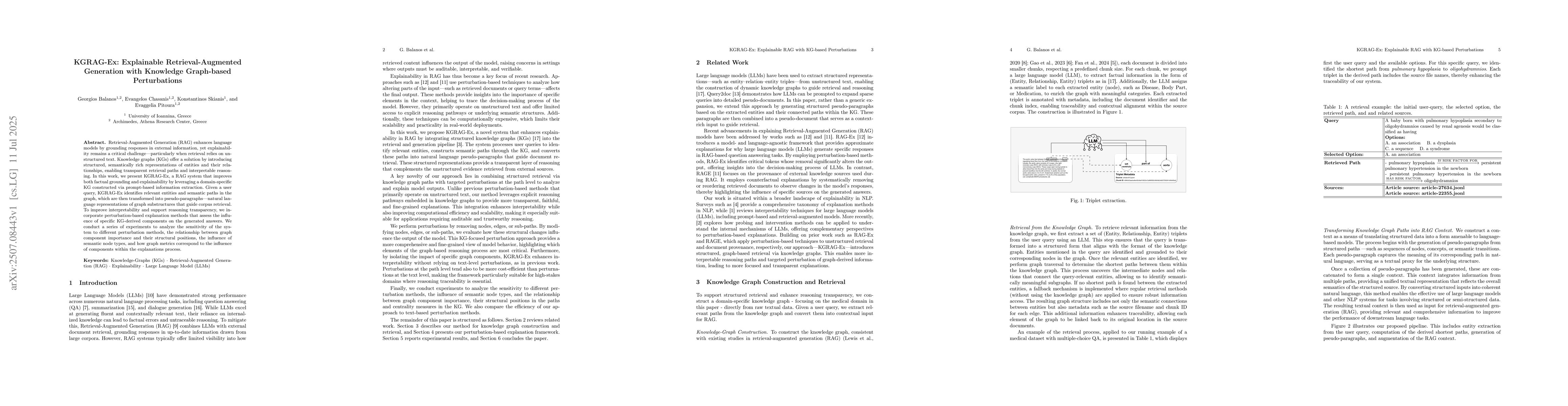 Retrieval-Augmented Generation (RAG) enhances language models by grounding responses in external information, yet explainability remains a critical challenge, particularly when retrieval relies on unstructured text. Knowledge graphs (KGs) offer a solution by introducing structured, semantically rich representations of entities and their relationships, enabling transparent retrieval paths and interpretable reasoning. In this work, we present KGRAG-Ex, a RAG system that improves both factual grounding and explainability by leveraging a domain-specific KG constructed via prompt-based information extraction. Given a user query, KGRAG-Ex identifies relevant entities and semantic paths in the graph, which are then transformed into pseudo-paragraphs: natural language representations of graph substructures that guide corpus retrieval. To improve interpretability and support reasoning transparency, we incorporate perturbation-based explanation methods that assess the influence of specific KG-derived components on the generated answers. We conduct a series of experiments to analyze the sensitivity of the system to different perturbation methods, the relationship between graph component importance and their structural positions, the influence of semantic node types, and how graph metrics correspond to the influence of components within the explanations process.