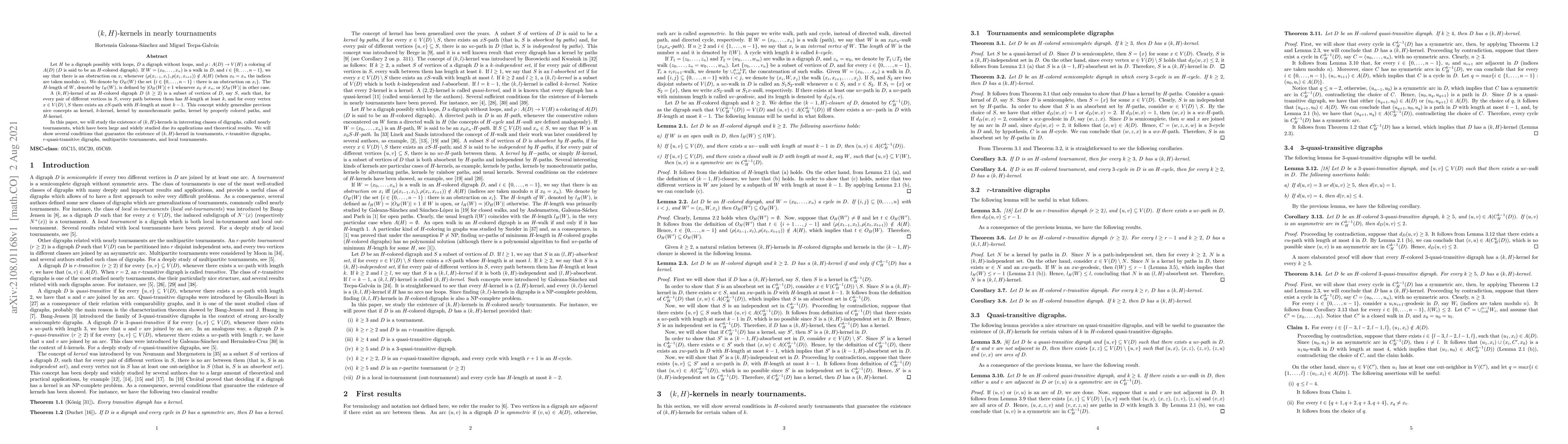 This paper explores $(k,H)$-kernels in nearly tournaments, defining $H$-colored digraphs and obstructions on walks, and introducing $(k,H)$-kernels as subsets of vertices ensuring specific $H$-length conditions for paths. The study reveals conditions for $(k,H)$-kernel existence in various classes of nearly tournaments, including tournaments and transitive structures.