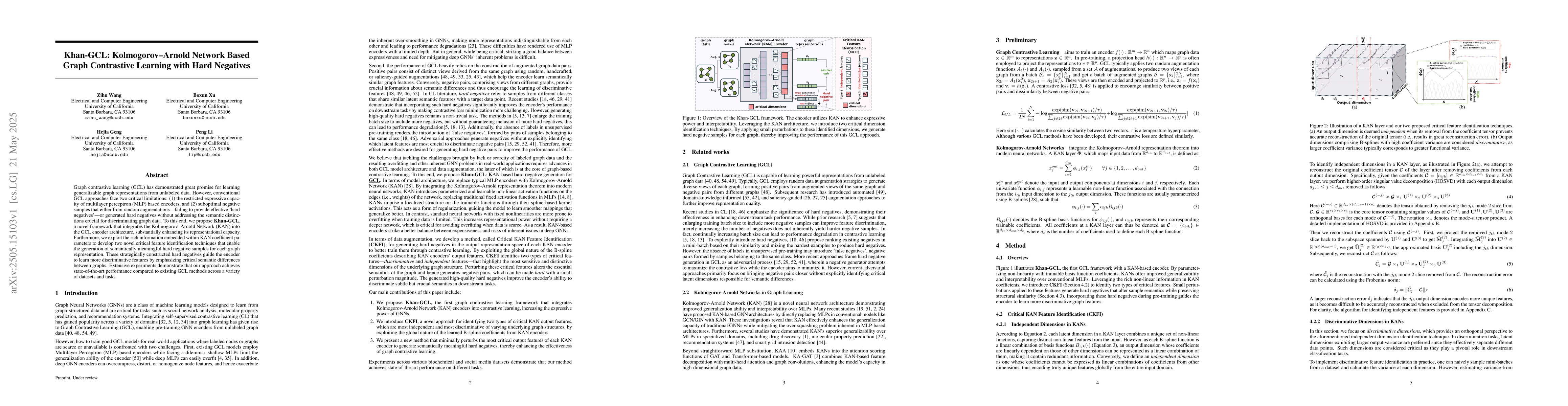 Khan-GCL distinguishes itself by introducing KAN into GCL for enhanced representation learning and employing KAN parameters to create critical feature identification techniques for generating hard negatives, addressing the need for more discriminative features in graph data.