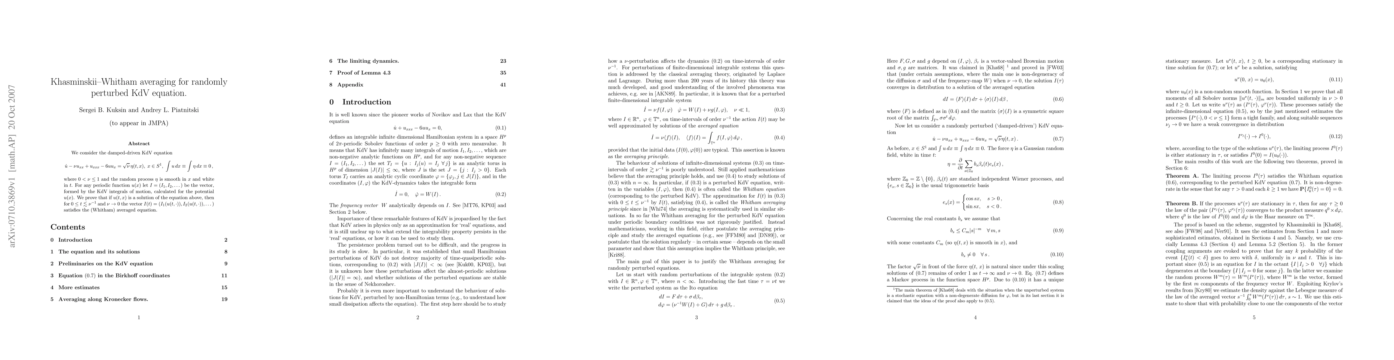 We consider the damped-driven KdV equation $$ \dot u-\nu{u_{xx}}+u_{xxx}-6uu_x=\sqrt\nu \eta(t,x), x\in S^1, \int u dx\equiv \int\eta dx\equiv0, $$ where $0<\nu\le1$ and the random process $\eta$ is smooth in $x$ and white in $t$. For any periodic function $u(x)$ let $ I=(I_1,I_2,...) $ be the vector, formed by the KdV integrals of motion, calculated for the potential $u(x)$. We prove that if $u(t,x)$ is a solution of the equation above, then for $0\le t\lesssim\nu^{-1}$ and $\nu\to0$ the vector $ I(t)=(I_1(u(t,\cdot)),I_2(u(t,\cdot)),...) $ satisfies the (Whitham) averaged equation.