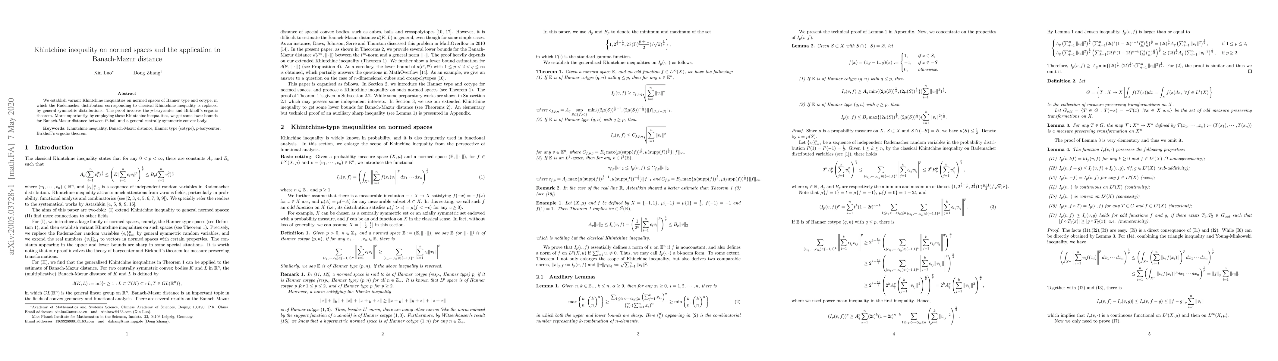 Summary: This paper establishes variant Khintchine inequalities on normed spaces using general symmetric distributions instead of the Rademacher distribution, employing $p$-barycenter and Birkhoff's ergodic theorem. It applies these inequalities to derive lower bounds for the Banach-Mazur distance between $l^p$-ball and general centrally symmetric convex bodies.