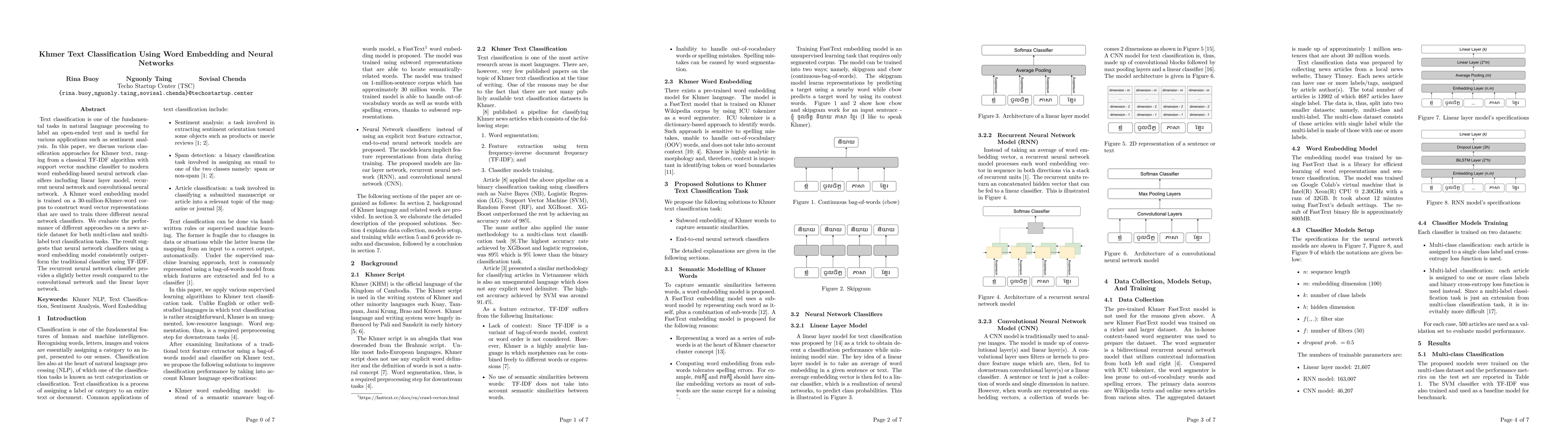 A Khmer word embedding model is trained on a 30-million-Khmer-word corpus to construct word vector representations used to train three different neural network classifiers.
