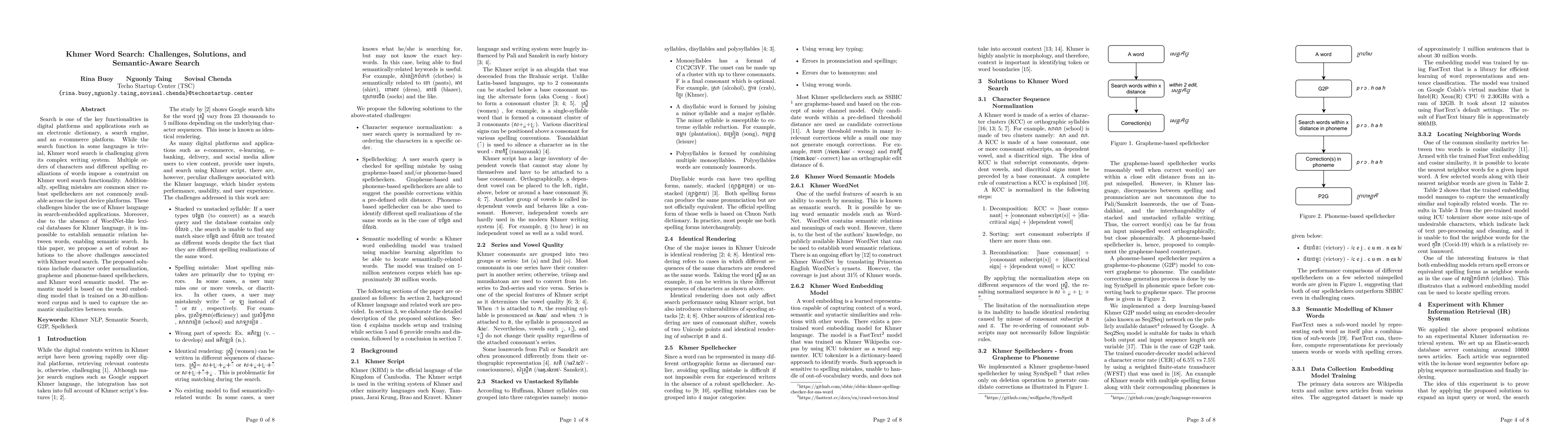 The paper presents a set of robust solutions for Khmer word search, including character sequence normalization, grapheme and phoneme-based spellcheckers, and a semantic model based on a word embedding model.
