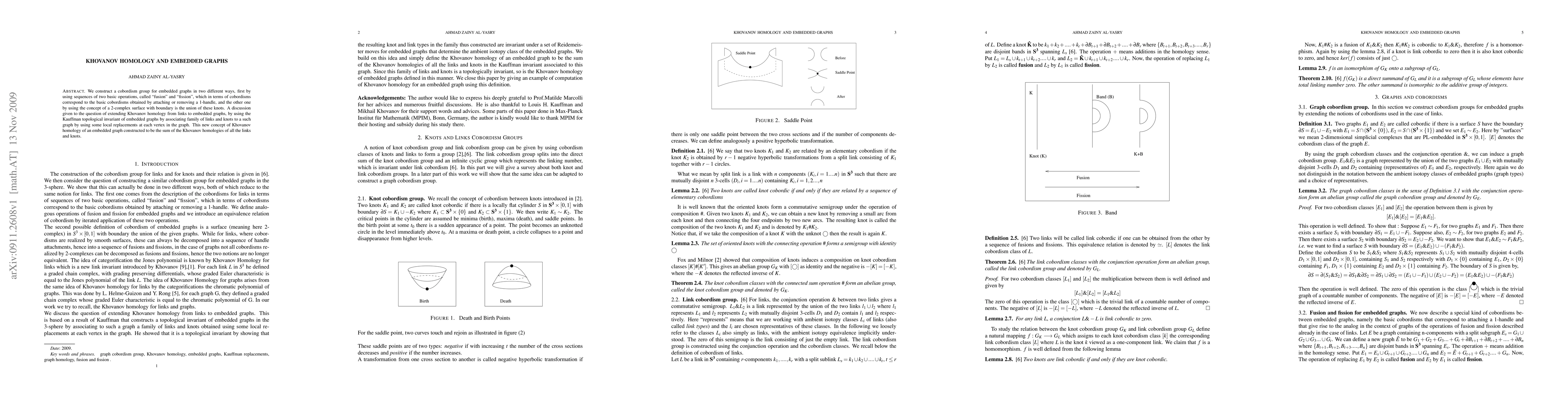 This paper constructs cobordism groups for embedded graphs using fusion and fission operations, linking these to 1-handle cobordisms. It extends Khovanov homology to embedded graphs by associating a family of links and knots via local replacements, summing their Khovanov homologies to define the graph's Khovanov homology.