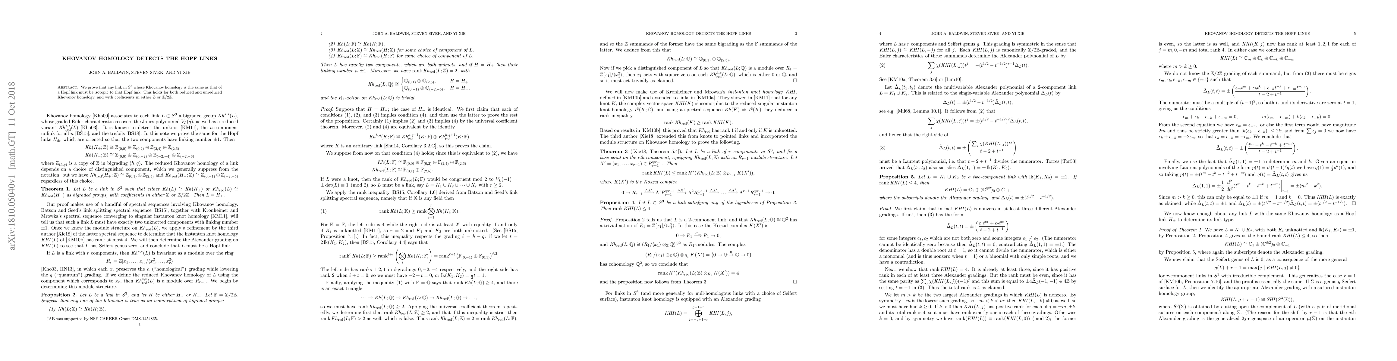 We prove that any link in $S^3$ whose Khovanov homology is the same as that of a Hopf link must be isotopic to that Hopf link. This holds for both reduced and unreduced Khovanov homology, and with coefficients in either $\mathbb{Z}$ or $\mathbb{Z}/2\mathbb{Z}$.