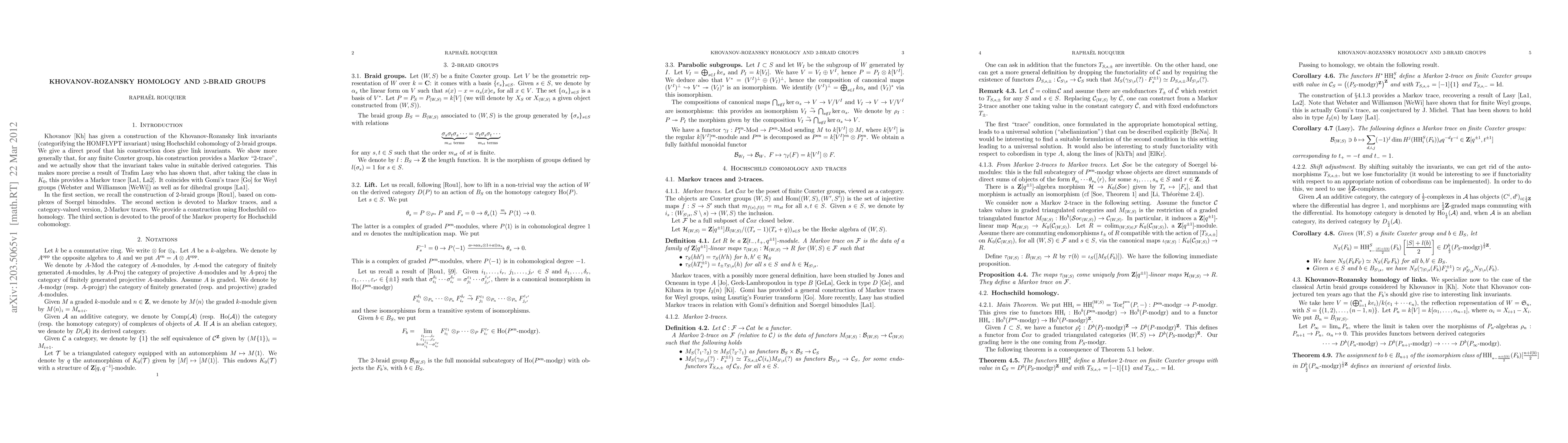 Khovanov has given a construction of the Khovanov-Rozansky link invariants (categorifying the HOMFLYPT invariant) using Hochschild cohomology of 2-braid groups. We give a direct proof that his construction does give link invariants. We show more generally that, for any finite Coxeter group, his construction provides a Markov "2-trace", and we actually show that the invariant takes value in suitable derived categories. This makes more precise a result of Trafim Lasy who has shown that, after taking the class in K_0, this provides a Markov trace.