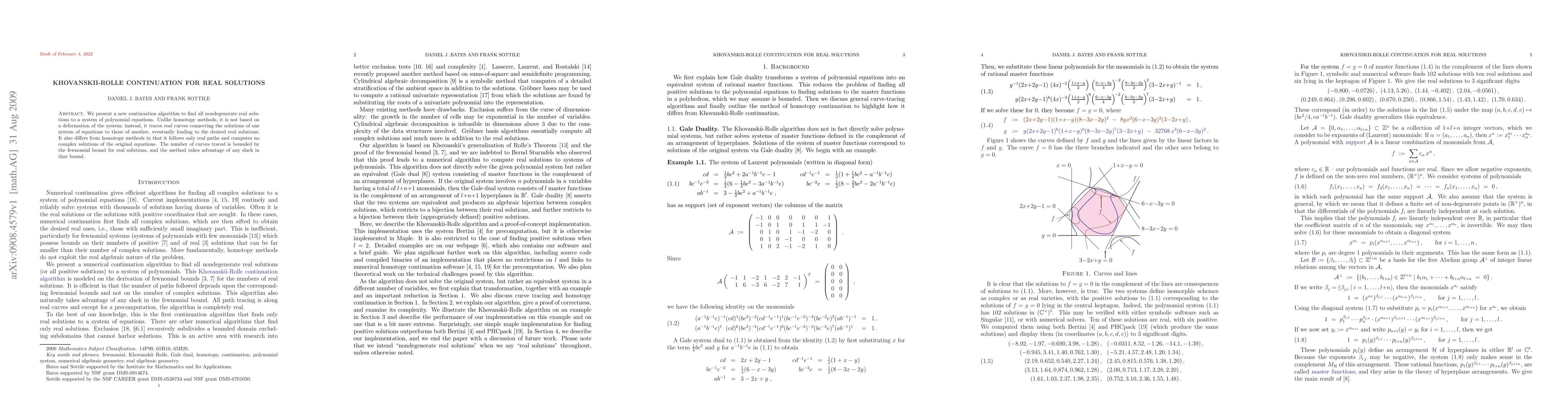 We present a new continuation algorithm to find all nondegenerate real solutions to a system of polynomial equations. Unlike homotopy methods, it is not based on a deformation of the system; instead, it traces real curves connecting the solutions of one system of equations to those of another, eventually leading to the desired real solutions. It also differs from homotopy methods in that it follows only real paths and computes no complex solutions of the original equations. The number of curves traced is bounded by the fewnomial bound for real solutions, and the method takes advantage of any slack in that bound.