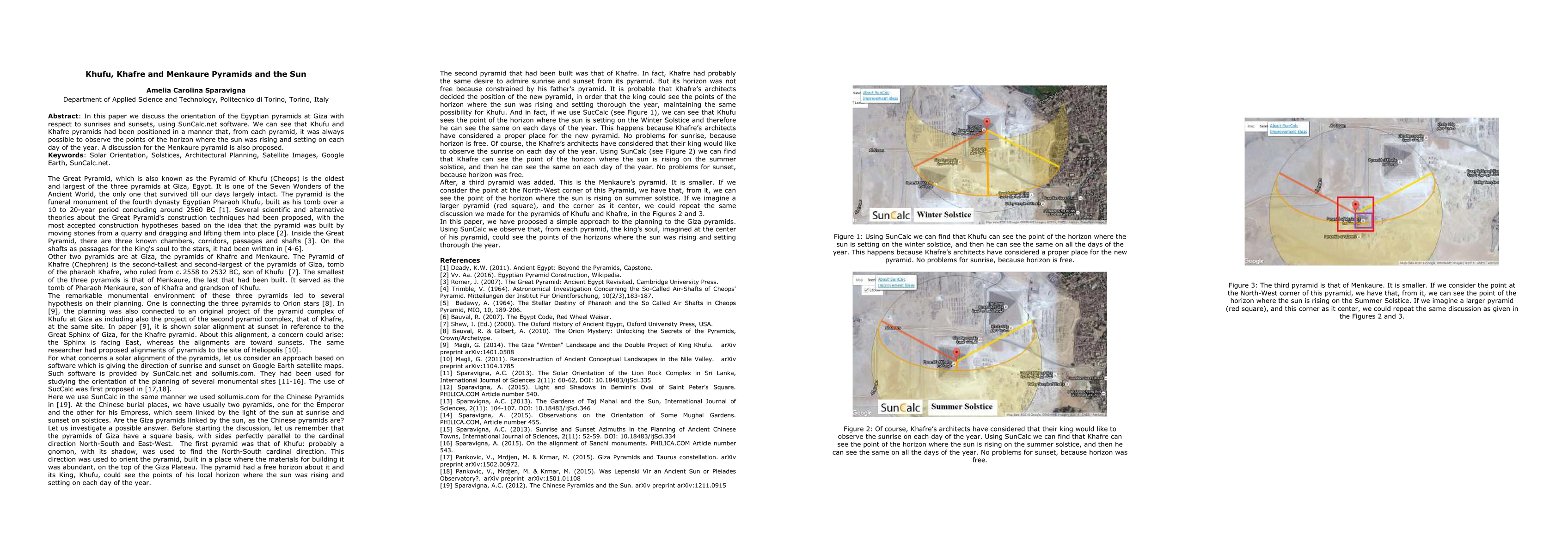 This paper examines the orientation of the Giza pyramids using SunCalc.net software, revealing that Khufu and Khafre pyramids are aligned to observe daily sunrises and sunsets, while a discussion on Menkaure's alignment is also presented.