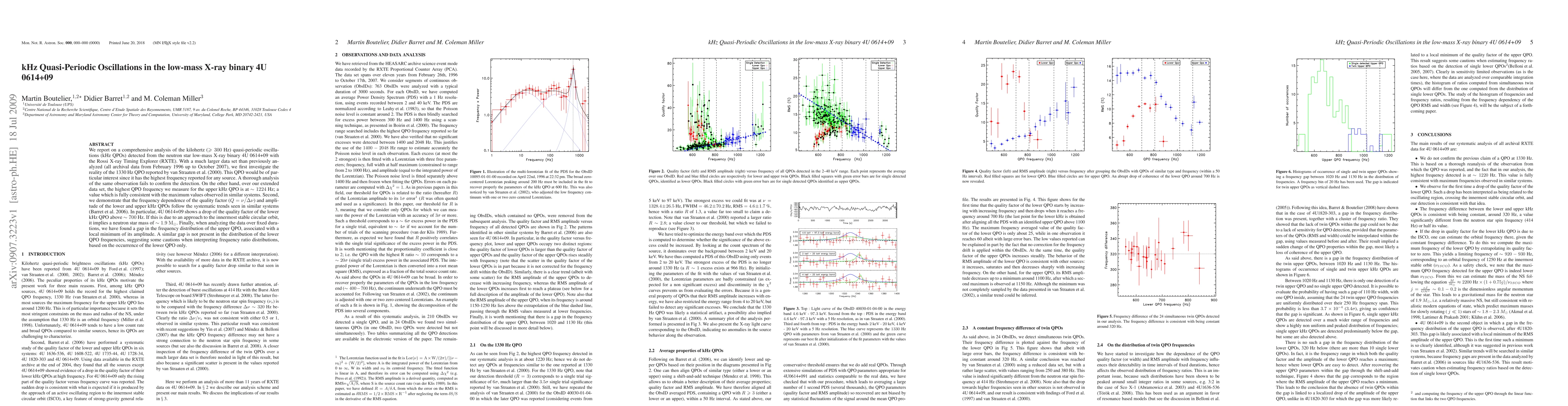 We report on a comprehensive analysis of the kilohertz (above 300 Hz) quasi-periodic oscillations (kHz QPOs) detected from the neutron star low-mass X-ray binary 4U0614+09 with the Rossi X-ray Timing Explorer (RXTE). With a much larger data set than previously analyzed (all archival data from February 1996 up to October 2007), we first investigate the reality of the 1330 Hz QPO reported by van Straaten et al. (2000). This QPO would be of particular interest since it has the highest frequency reported for any source. A thorough analysis of the same observation fails to confirm the detection. On the other hand, over our extended data set, the highest QPO frequency we measure for the upper kHz QPO is at about 1224 Hz; a value which is fully consistent with the maximum values observed in similar systems. Second, we demonstrate that the frequency dependence of the quality factor and amplitude of the lower and upper kHz QPOs follow the systematic trends seen in similar systems (Barret et al., 2006). In particular, 4U0614+09 shows a drop of the quality factor of the lower kHz QPO above 700 Hz. If this is due to an approach to the innermost stable circular orbit, it implies a neutron star mass of about 1.9 solar masses. Finally, when analyzing the data over fixed durations, we have found a gap in the frequency distribution of the upper QPO, associated with a local minimum of its amplitude. A similar gap is not present in the distribution of the lower QPO frequencies, suggesting some cautions when interpreting frequency ratio distributions, based on the occurrence of the lower QPO only.