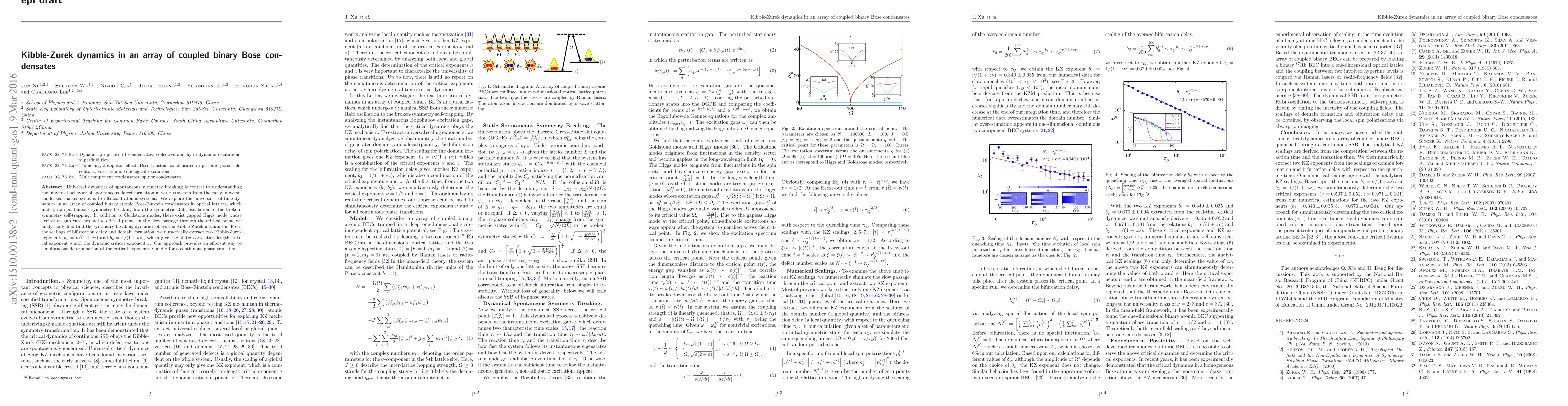 Universal dynamics of spontaneous symmetry breaking is central to understanding the universal behavior of spontaneous defect formation in various system from the early universe, condensed-matter systems to ultracold atomic systems. We explore the universal real-time dynamics in an array of coupled binary atomic Bose-Einstein condensates in optical lattices, which undergo a spontaneous symmetry breaking from the symmetric Rabi oscillation to the broken-symmetry self-trapping. In addition to Goldstone modes, there exist gapped Higgs mode whose excitation gap vanishes at the critical point. In the slow passage through the critical point, we analytically find that the symmetry-breaking dynamics obeys the Kibble-Zurek mechanism. From the scalings of bifurcation delay and domain formation, we numerically extract two Kibble-Zurek exponents $b_{1}=\nu/(1+\nu z)$ and $b_{2}=1/(1+\nu z)$, which give the static correlation-length critical exponent $\nu$ and the dynamic critical exponent $z$. Our approach provides an efficient way to simultaneous determination of the critical exponents $\nu$ and $z$ for a continuous phase transition.