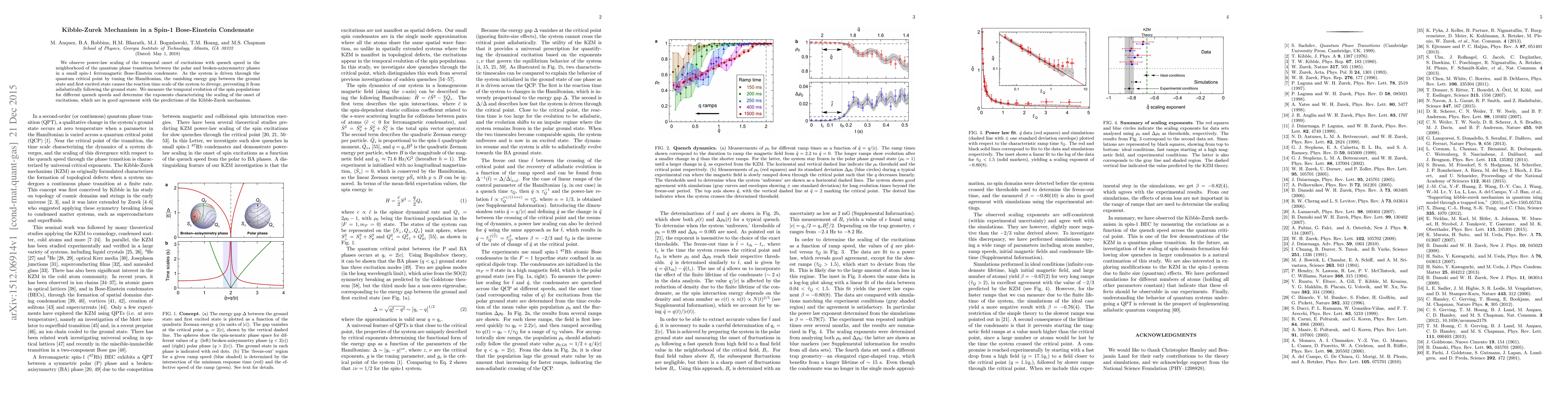 The study investigates the Kibble-Zurek mechanism in a spin-1 Bose-Einstein condensate, observing power-law scaling of excitation onset with quench speed near a quantum phase transition. The results confirm the theoretical predictions of the Kibble-Zurek mechanism as the system's reaction time diverges with the vanishing energy gap.
