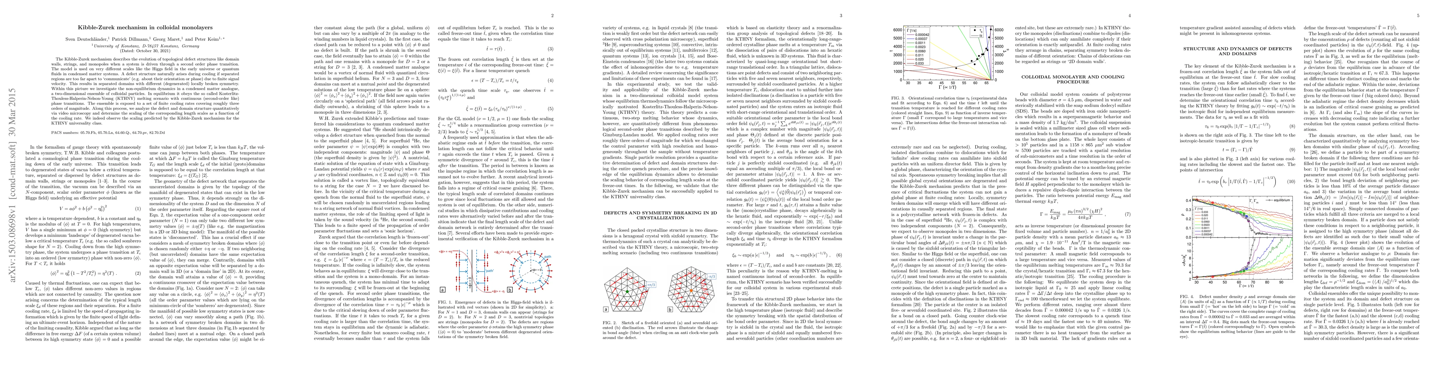 The paper presents a detailed analysis of topological defect structures in a 2D colloidal monolayer under various cooling rates, demonstrating the Kibble-Zurek mechanism's applicability and providing quantitative measurements of defect and domain structures.