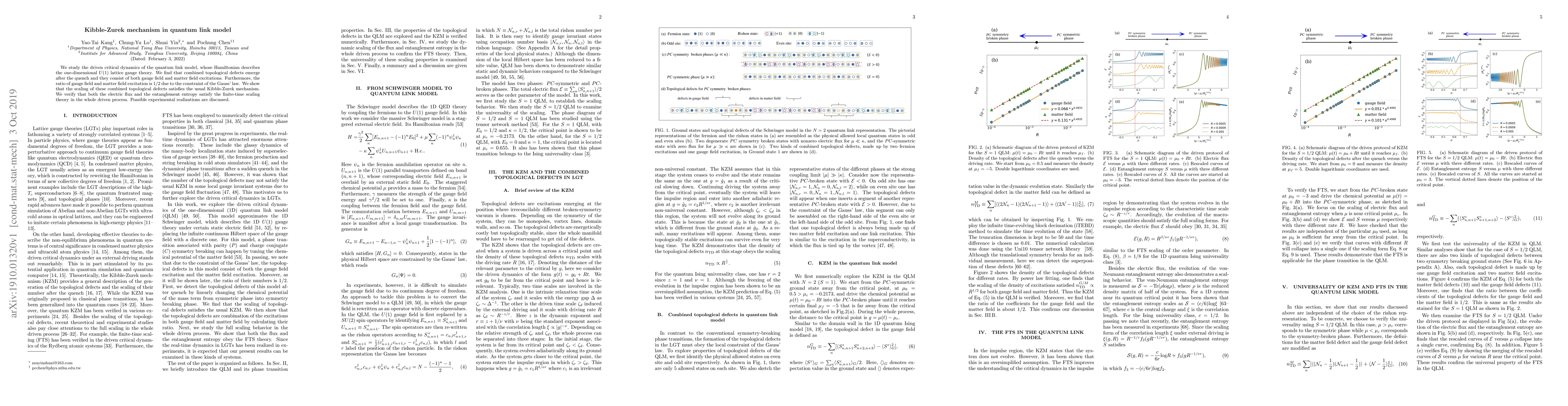 This study investigates the driven critical dynamics in the quantum link model, revealing the emergence of combined topological defects in the gauge field and matter field after a quench. The ratio of these defects adheres to a 1/2 due to Gauss' law, and the scaling behavior conforms to the Kibble-Zurek mechanism. Both electric flux and entanglement entropy show finite-time scaling throughout the process, with potential experimental implications discussed.