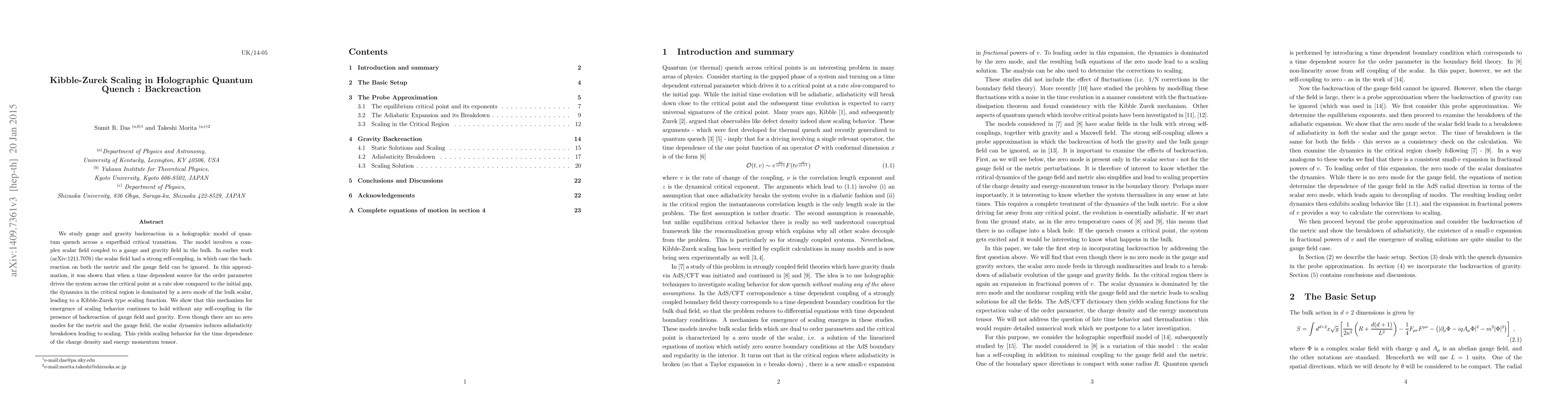 We study gauge and gravity backreaction in a holographic model of quantum quench across a superfluid critical transition. The model involves a complex scalar field coupled to a gauge and gravity field in the bulk. In earlier work (arXiv:1211.1776) the scalar field had a strong self-coupling, in which case the backreaction on both the metric and the gauge field can be ignored. In this approximation, it was shown that when a time dependent source for the order parameter drives the system across the critical point at a rate slow compared to the initial gap, the dynamics in the critical region is dominated by a zero mode of the bulk scalar, leading to a Kibble-Zurek type scaling function. We show that this mechanism for emergence of scaling behavior continues to hold without any self-coupling in the presence of backreaction of gauge field and gravity. Even though there are no zero modes for the metric and the gauge field, the scalar dynamics induces adiabaticity breakdown leading to scaling. This yields scaling behavior for the time dependence of the charge density and energy momentum tensor.