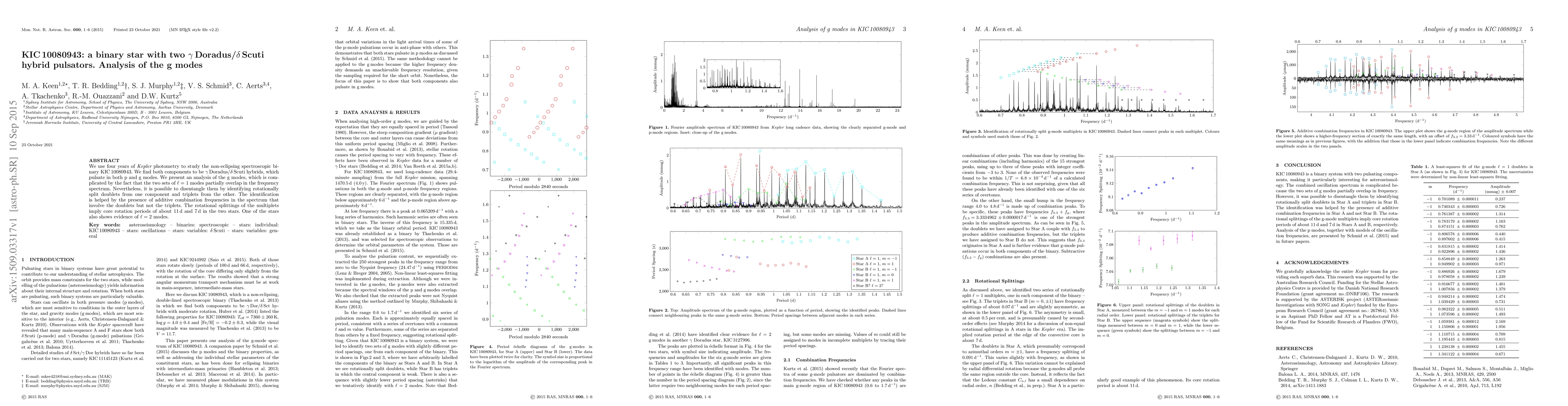This paper analyzes KIC 10080943, a binary star system where both components exhibit $\gamma$ Doradus/$\delta$ Scuti hybrid pulsations in both p and g modes. The study disentangles the overlapping g modes by identifying rotationally split multiplets and combination frequencies, revealing core rotation periods of 11 and 7 days for the two stars.