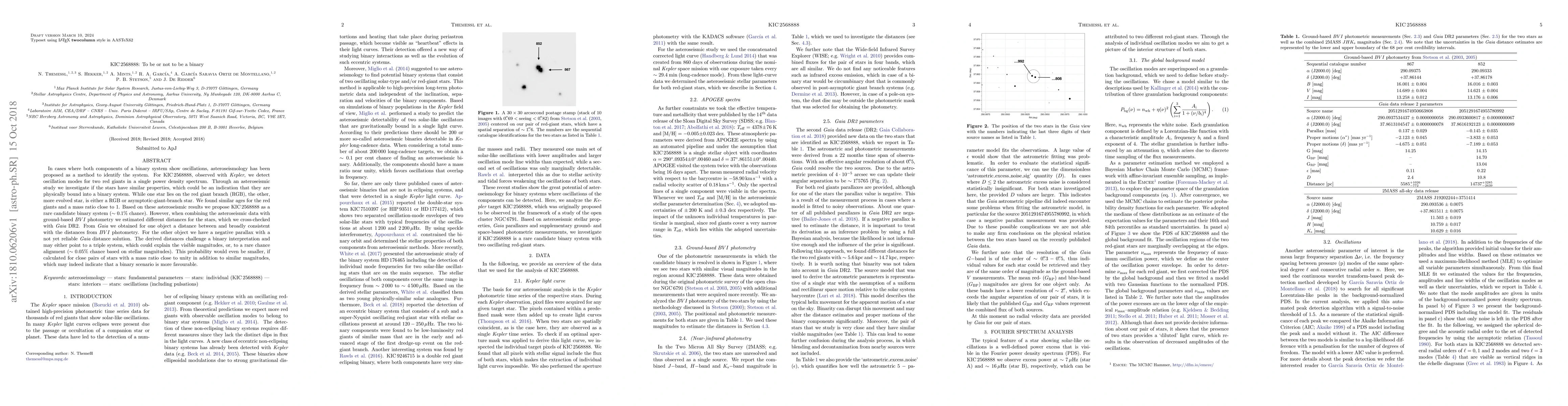 In cases where both components of a binary system show oscillations, asteroseismology has been proposed as a method to identify the system. For KIC 2568888, observed with $Kepler$, we detect oscillation modes for two red giants in a single power density spectrum. Through an asteroseismic study we investigate if the stars have similar properties, which could be an indication that they are physically bound into a binary system. While one star lies on the red giant branch (RGB), the other, more evolved star, is either a RGB or asymptotic-giant-branch star. We found similar ages for the red giants and a mass ratio close to 1. Based on these asteroseismic results we propose KIC 2568888 as a rare candidate binary system ($\sim 0.1\%$ chance). However, when combining the asteroseismic data with ground-based $BVI$ photometry we estimated different distances for the stars, which we cross-checked with $Gaia$ DR2. From $Gaia$ we obtained for one object a distance between and broadly consistent with the distances from $BVI$ photometry. For the other object we have a negative parallax with a not yet reliable $Gaia$ distance solution. The derived distances challenge a binary interpretation and may either point to a triple system, which could explain the visible magnitudes, or, to a rare chance alignment ($\sim 0.05\%$ chance based on stellar magnitudes). This probability would even be smaller, if calculated for close pairs of stars with a mass ratio close to unity in addition to similar magnitudes, which may indeed indicate that a binary scenario is more favourable.