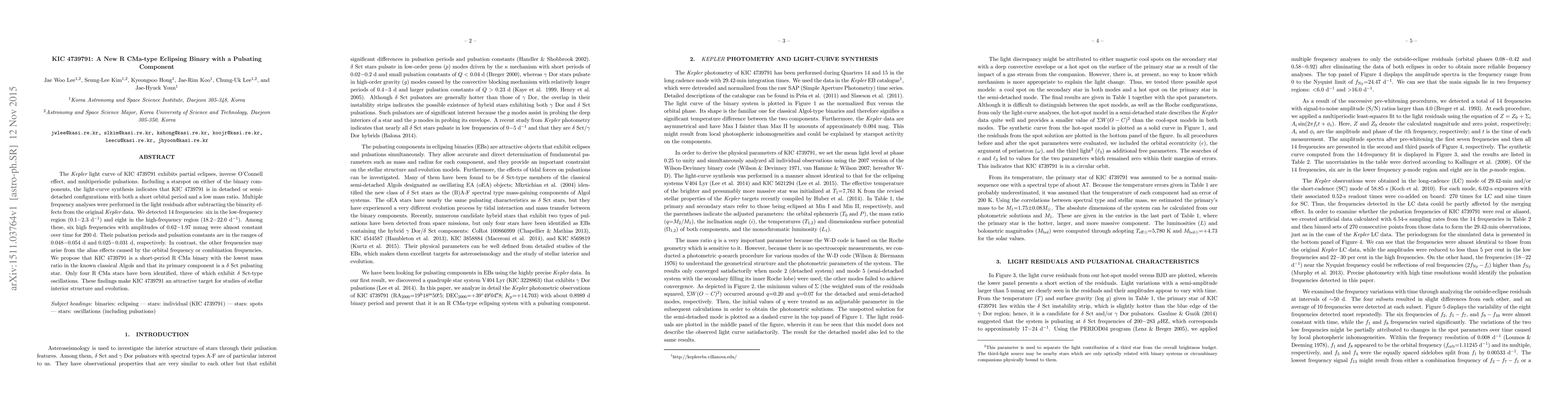 KIC 4739791 is identified as a new R CMa-type eclipsing binary with a pulsating component, exhibiting partial eclipses and multiperiodic pulsations. The system is characterized by a short orbital period and low mass ratio, with the primary component identified as a δ Sct pulsator.
